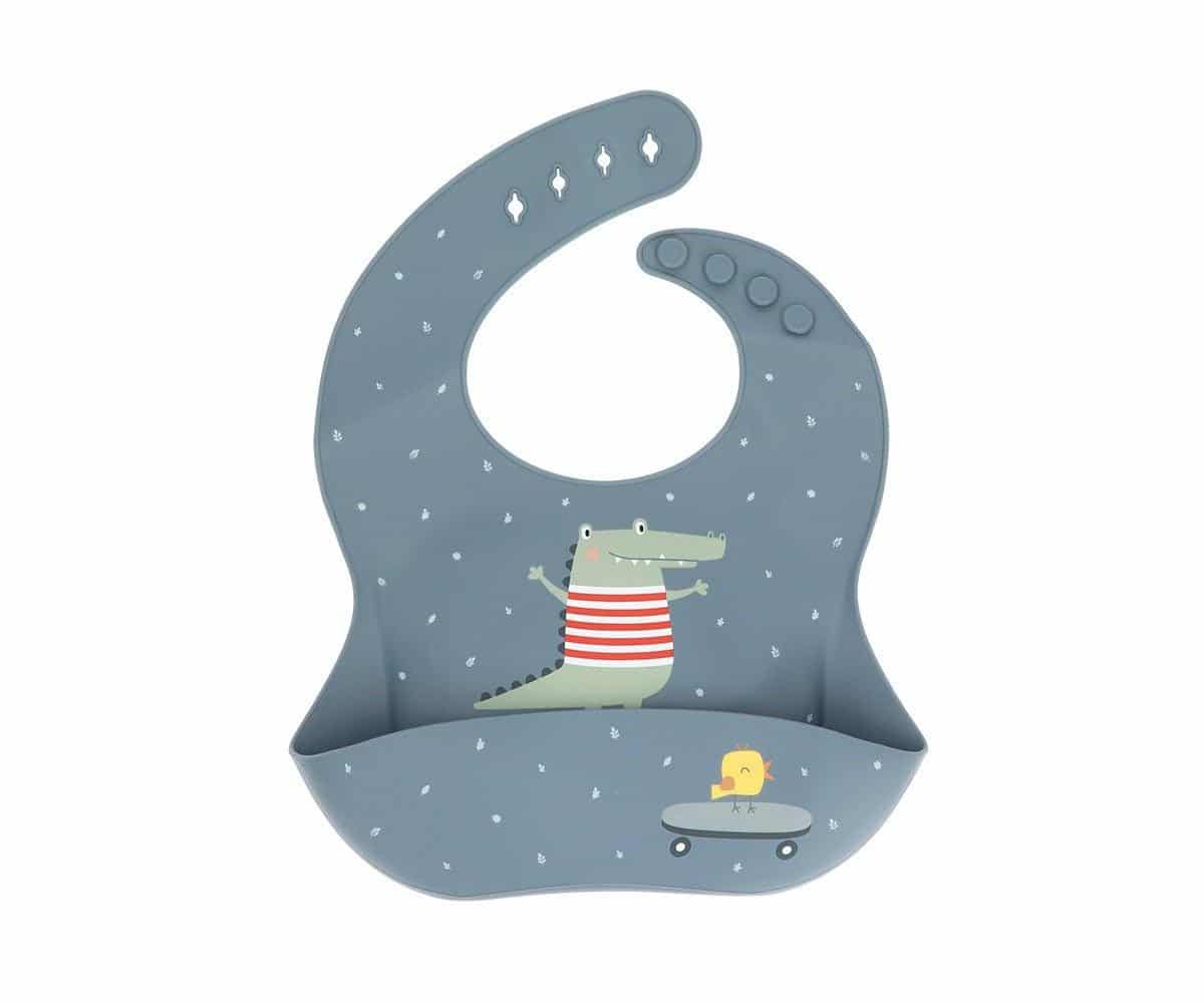 Babero de silicona con un bolsillo recogemigas para evitar que caiga la comida a la ropa.Es bastante flexible y se puede doblar fácilmente para llevar el el bolso cambiador sin ocupar mucho espacio.