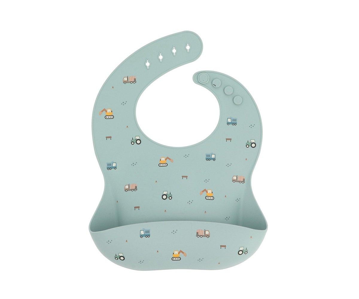 Babero de silicona con un bolsillo recogemigas para evitar que caiga la comida a la ropa.Es bastante flexible y se puede doblar fácilmente para llevar el el bolso cambiador sin ocupar mucho espacio.
