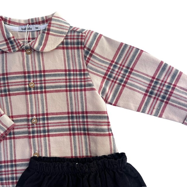 Camisa de color camel con estampado de cuadro tartán en color granate. Cuello bebé y apertura en la parte delantera.