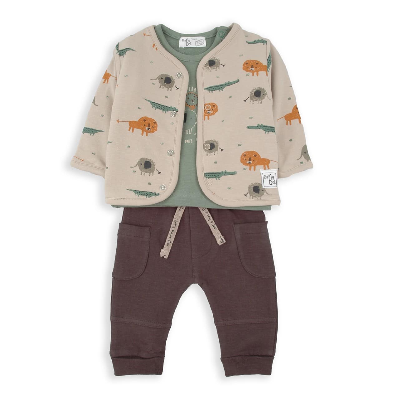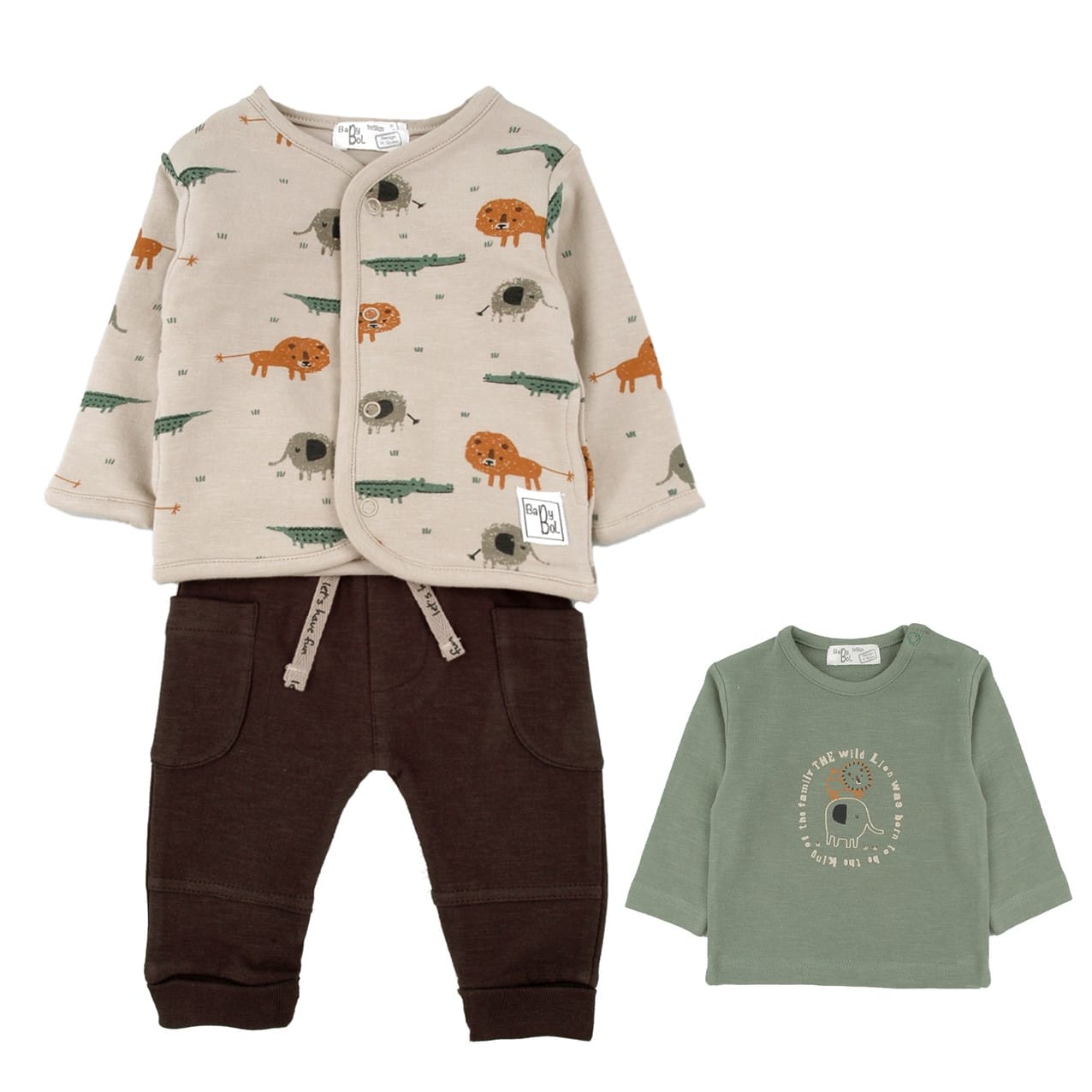 Chaqueta con estampado de animalitos en tonos naranjas y camiseta de color verde con estampado león.