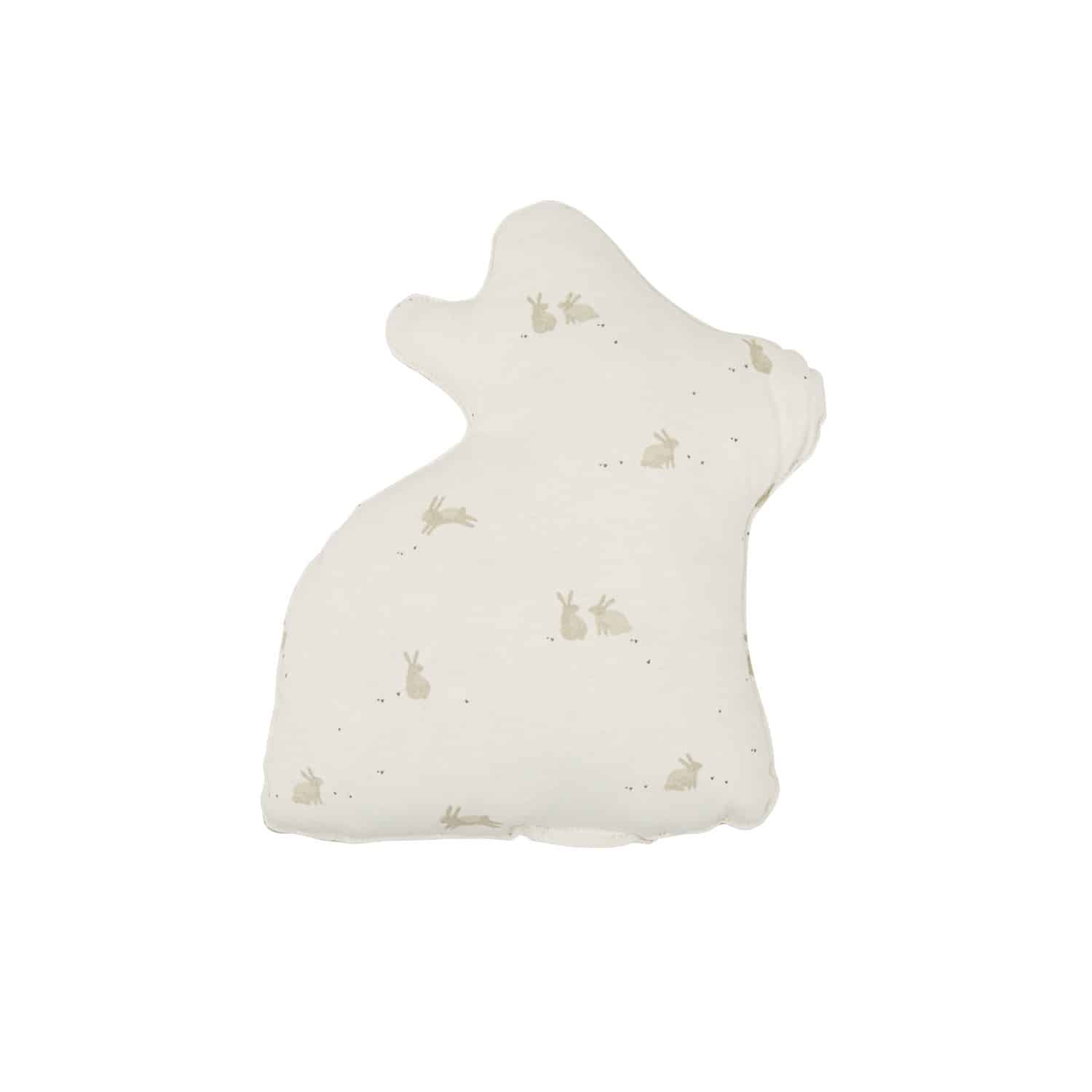 Cojín Decorativo Bimbidreams Bunny de estilo alegre y dulce, confeccionado en suave tejido 100% algodón orgánico certificado eco-friendly. Se presenta en forma de conejito en una combinación de colores blanco y verde a juego con la colección.