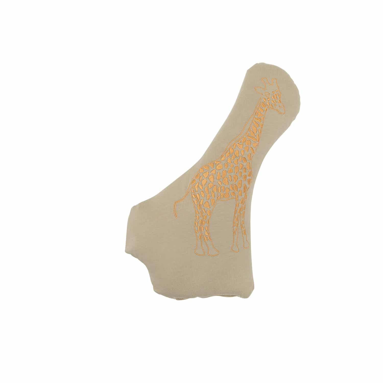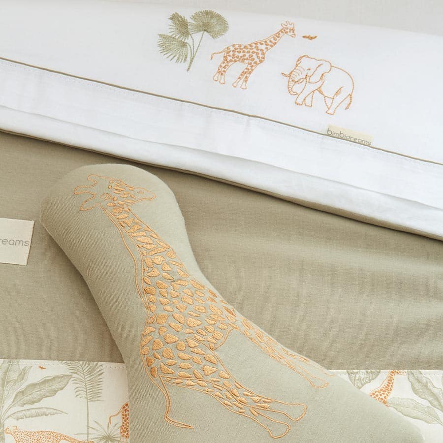 Cojín Decorativo Bimbidreams Masai de estilo alegre y vibrante, confeccionado en suave tejido 100% algodón orgánico certificado eco-friendly. Se presenta en forma de adorable jirafa a juego con la colección. ¡Haz que tu peque brille rodeado de la naturaleza más bella y salvaje!