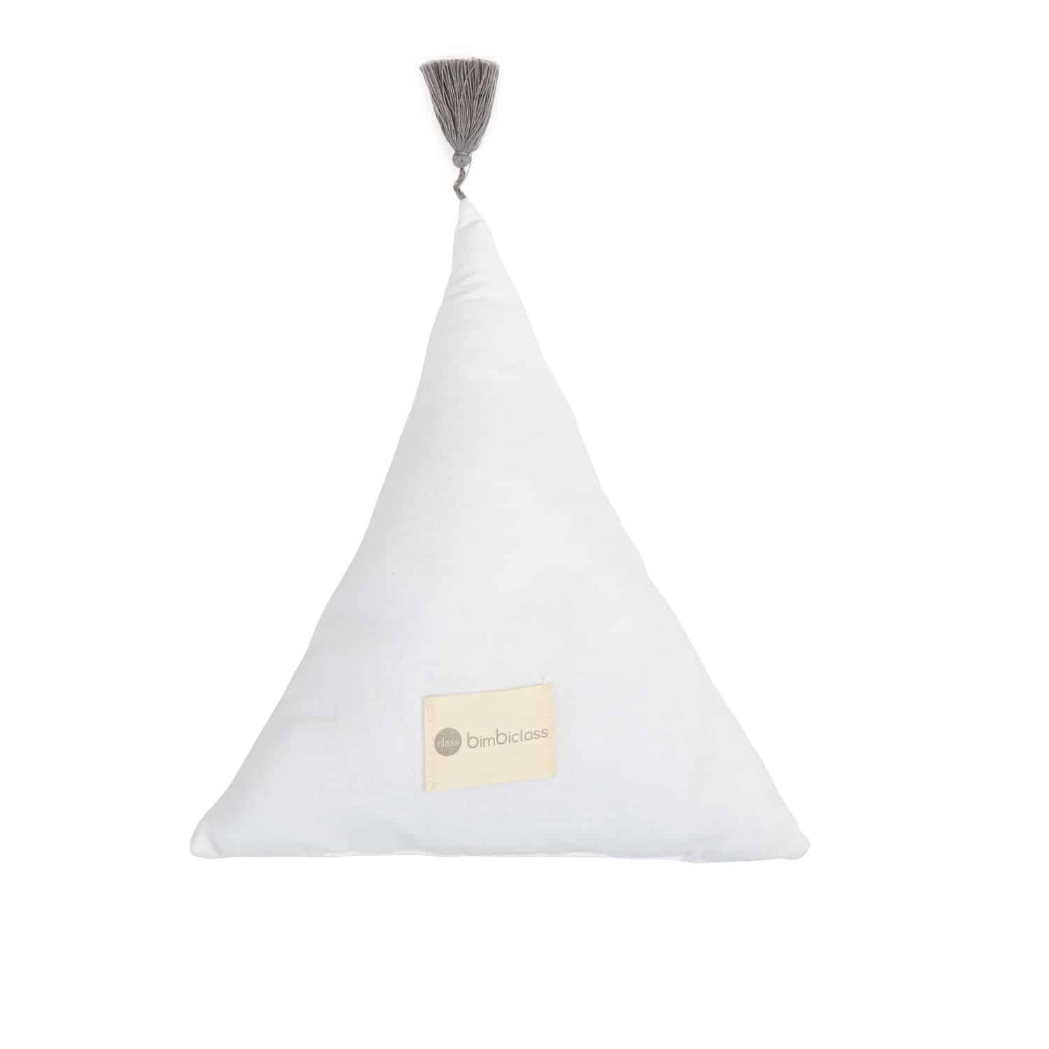 Cojín con forma de triángulo en algodón 100% de color blanco y pompón en color gris.