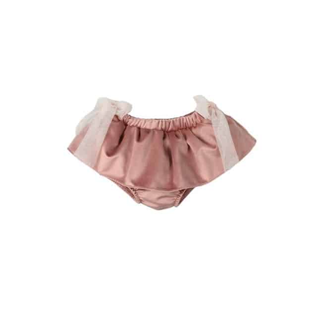Ranita de color orquídea viejo de terciopelo con detalle lazos de gasa a los lados.