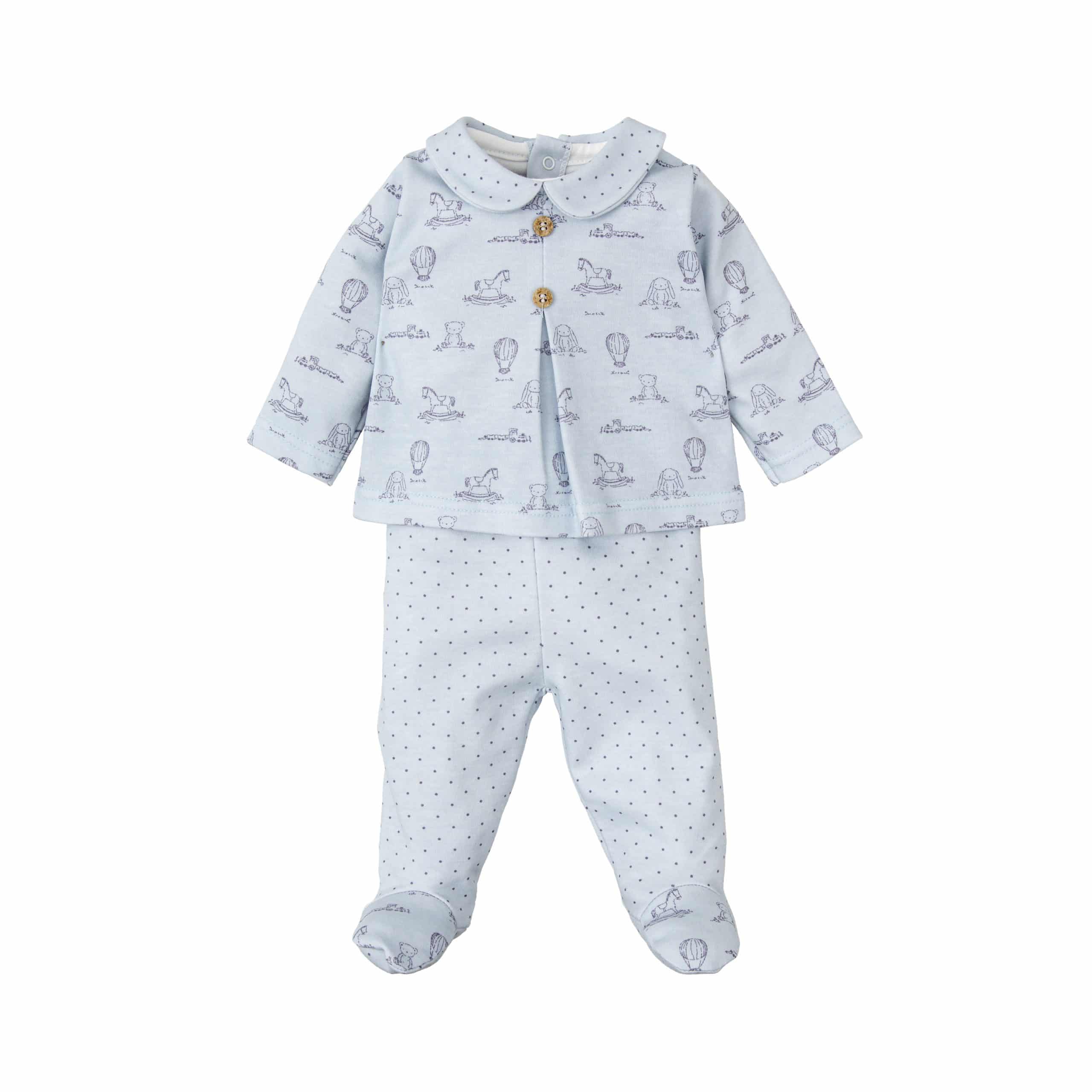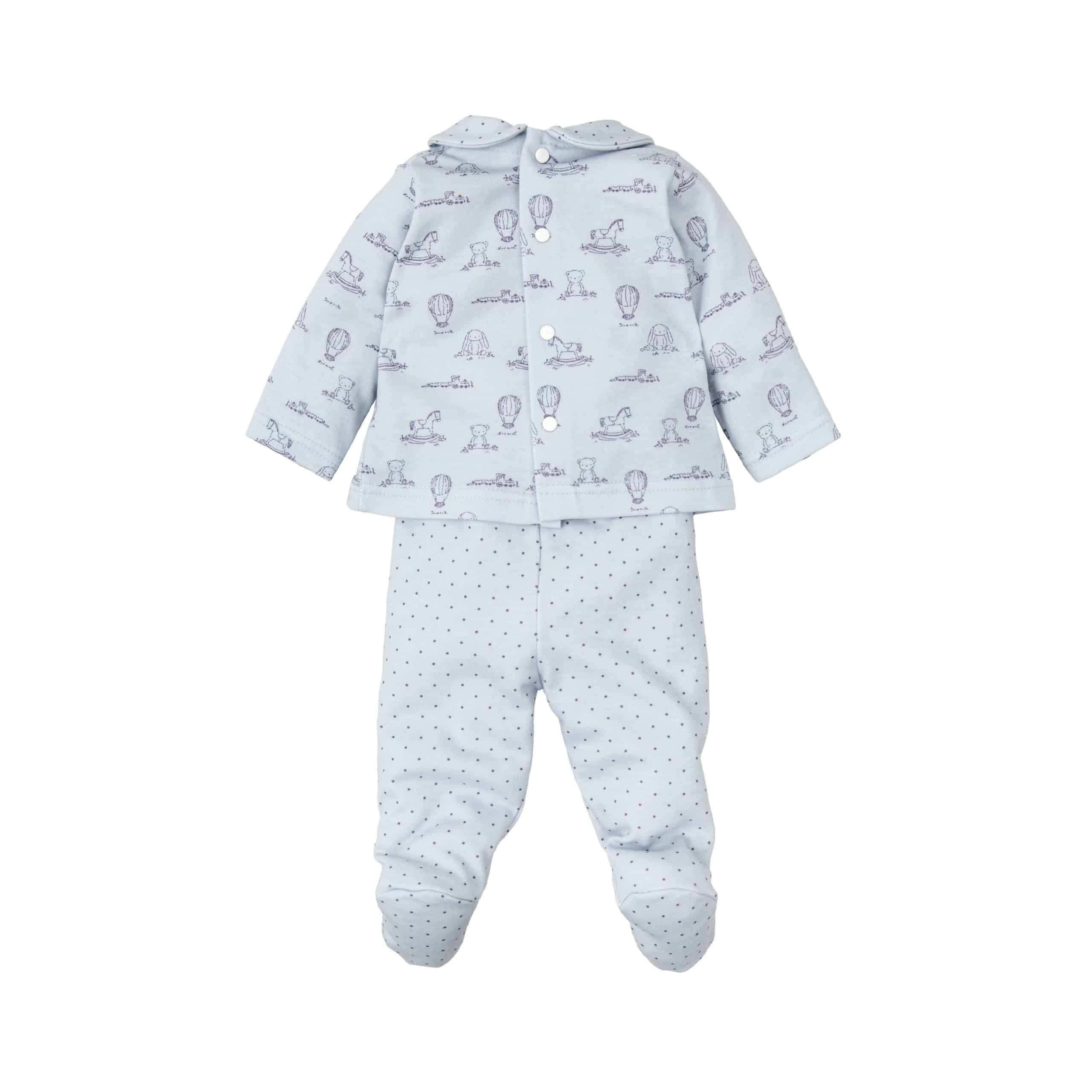 Conjunto 100 % algodón en color azul celeste con estampado de globos y topitos en gris.Apertura en la parte trasera con corchetes automáticos