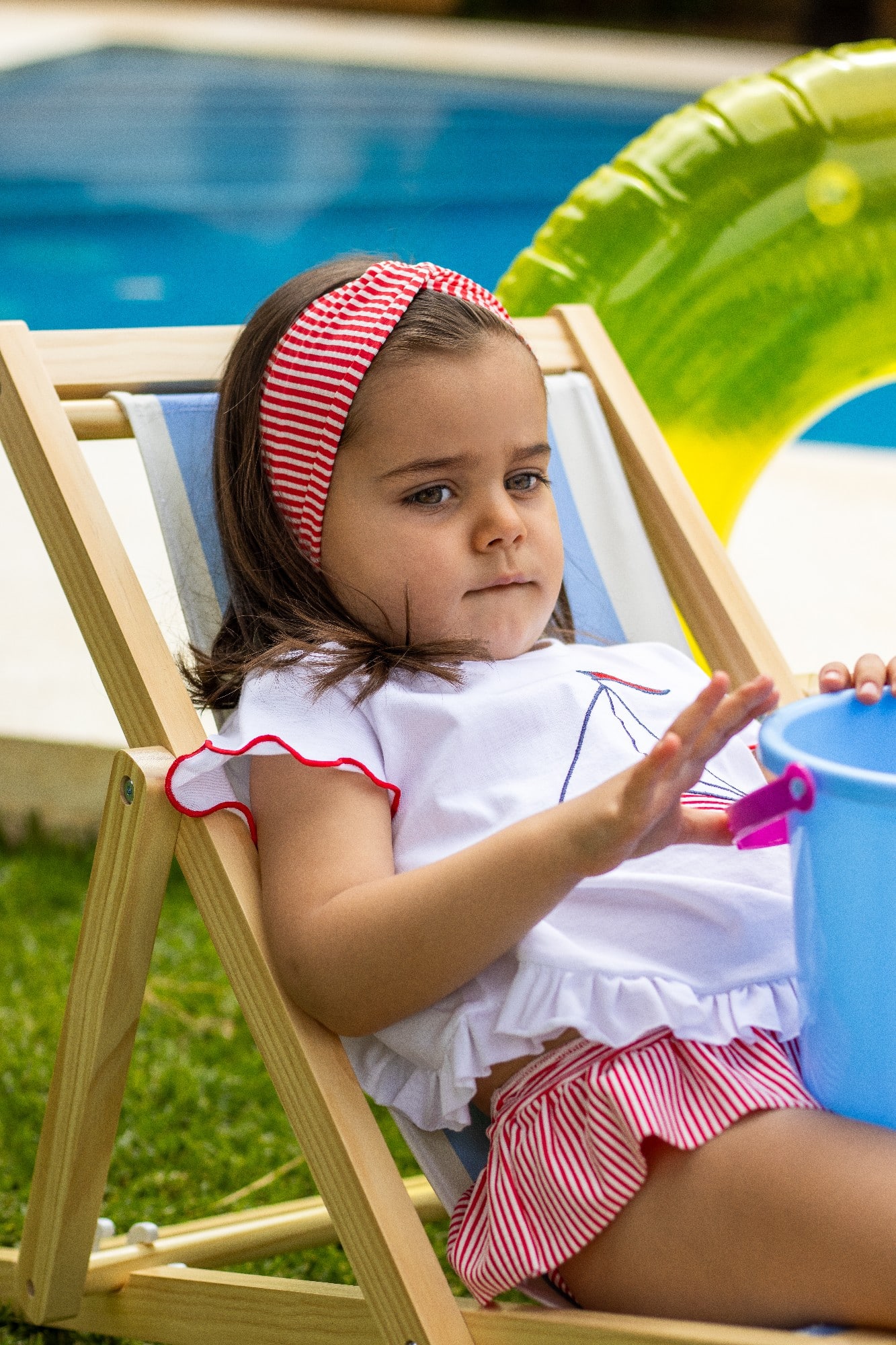 Braguita de color rojo con estampado de rayas y volante.