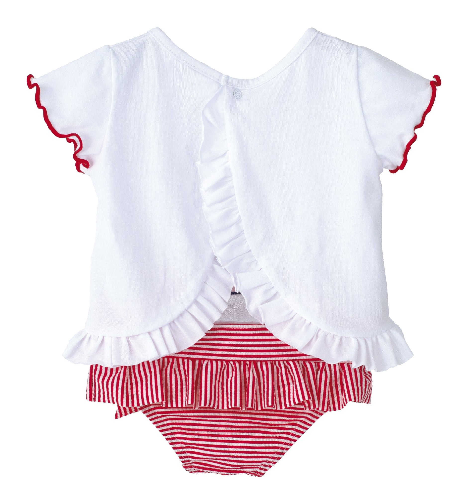 Camiseta de color blanco con estampado barquito en color rojo. Detalle volantes y apertura en la espalda.