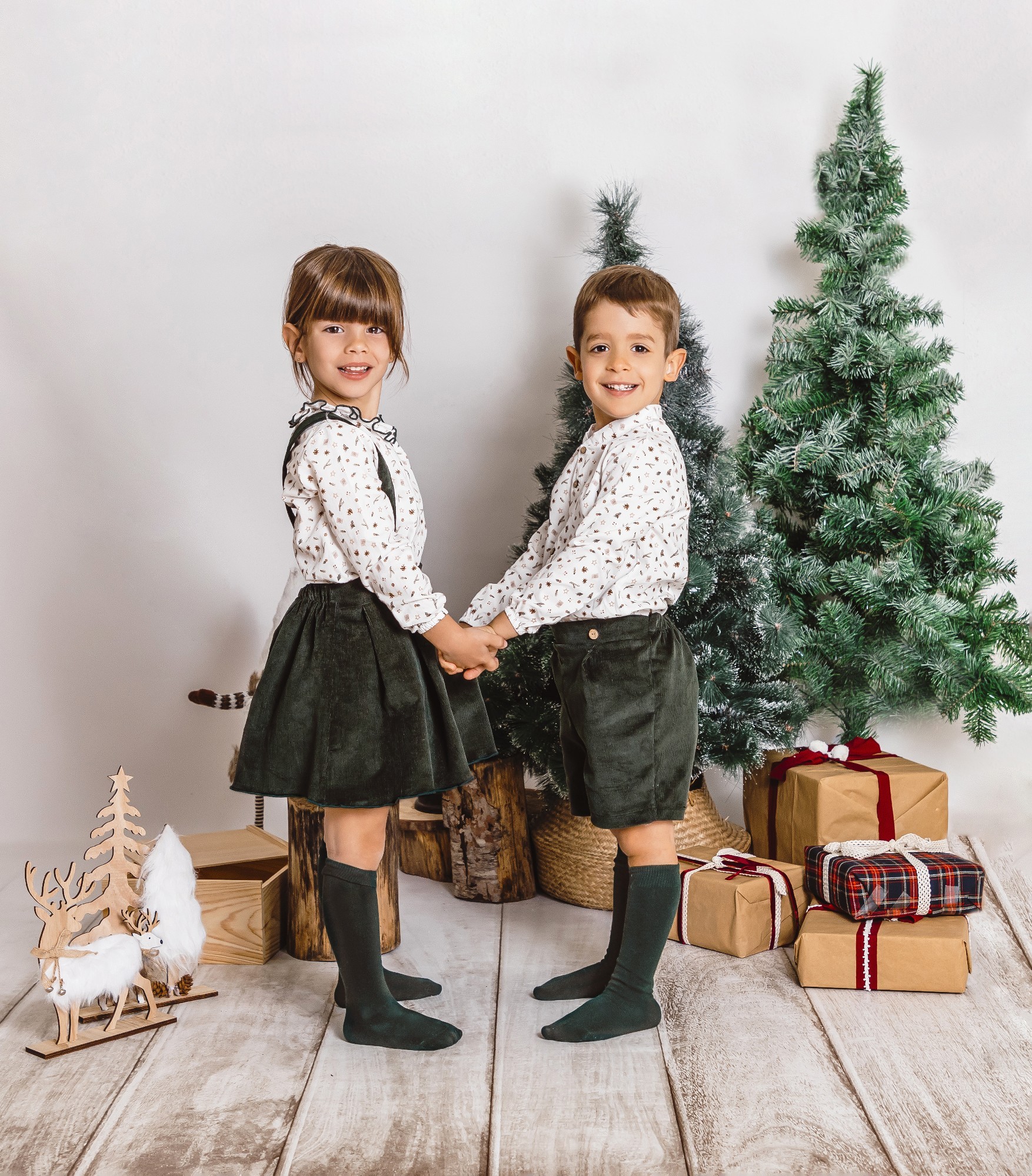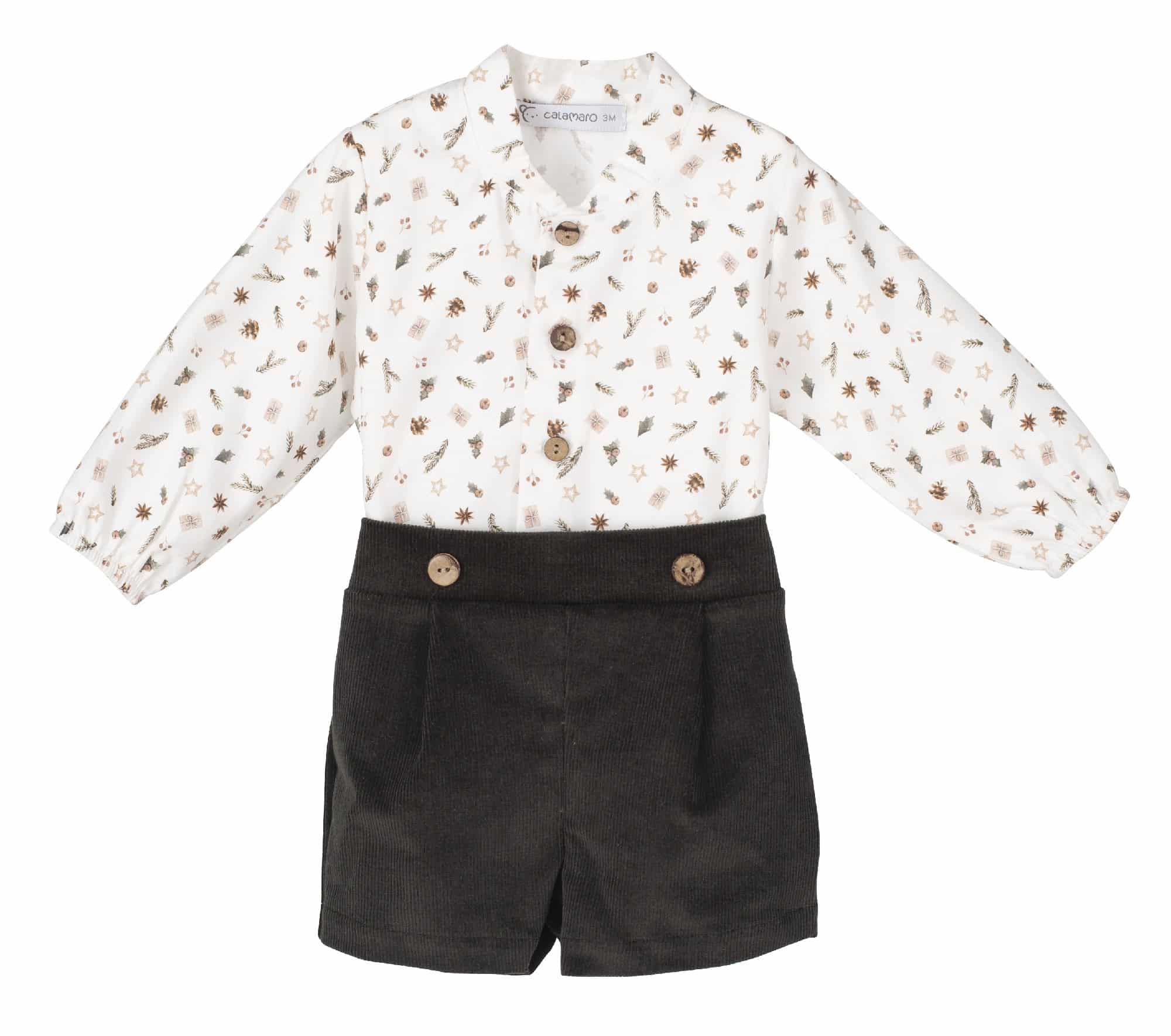 Camisa 100% algodón de color blanco con estampado navideño en tonos marrones.