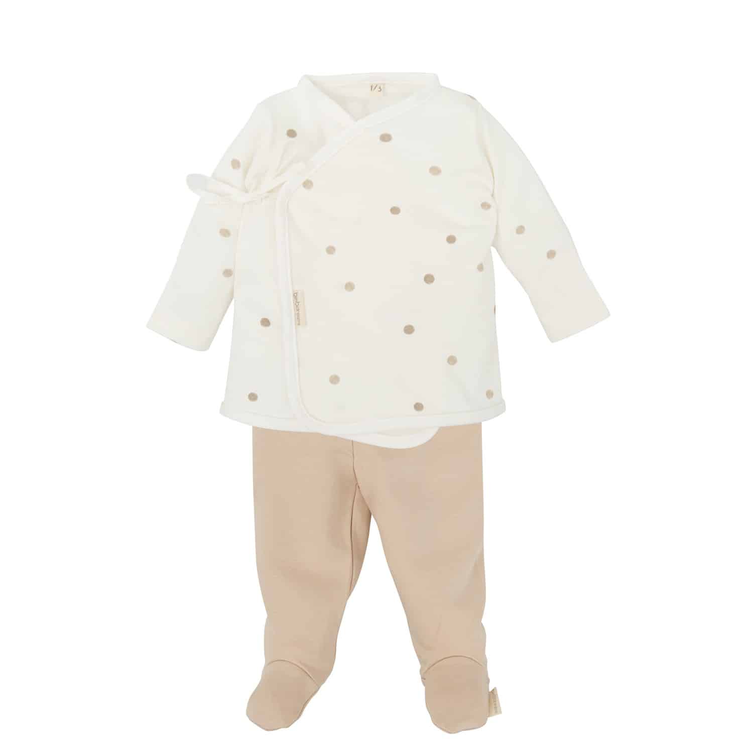 Conjunto dos piezas de algodón 100%, tejido elástico ideal para las primeras semanas de vida.