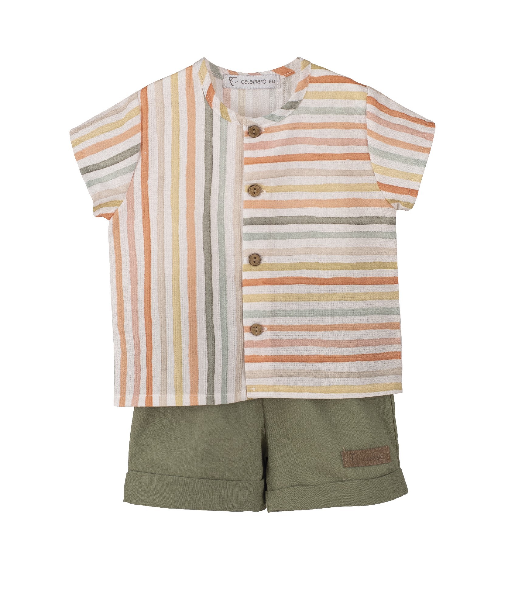 Camisa de lino con estampado de rayas de colores. Apertura en la parte delantera con botones de madera.