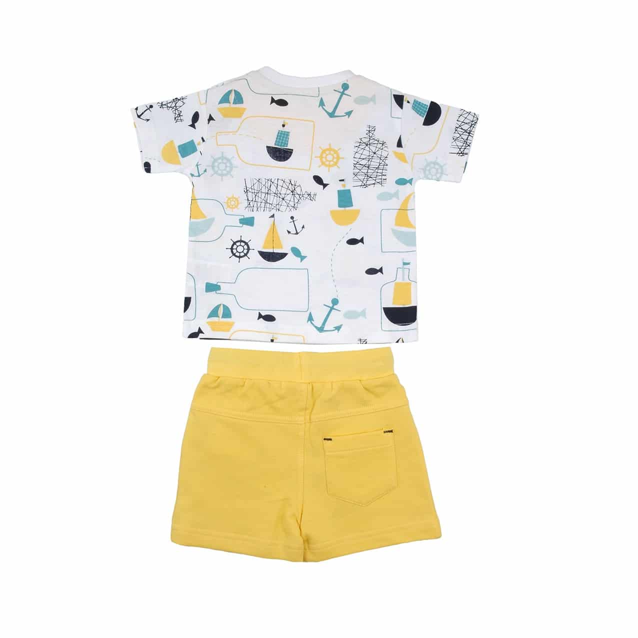 Camiseta de manga corta en color blanco con estampado marinero. Apertura en el hombro con corchetes.