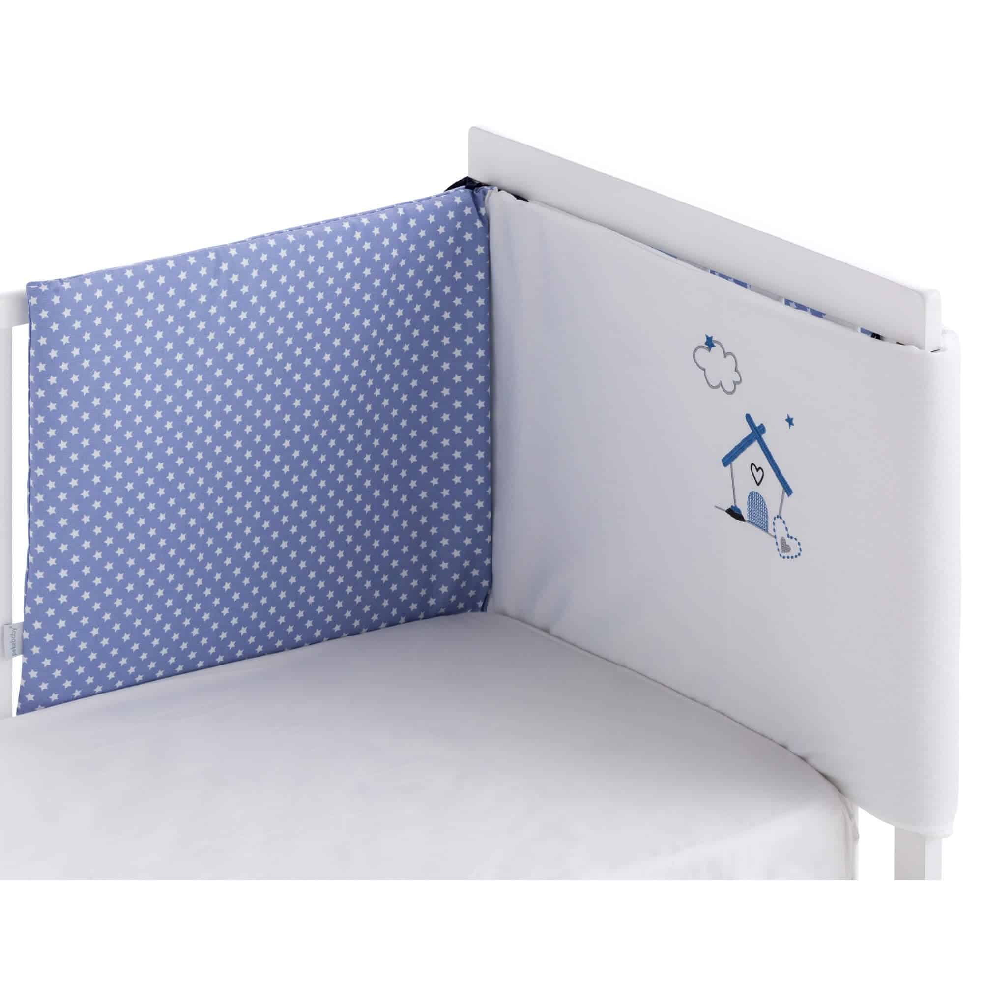 Protector en color combinado con azul y dibujo casa bordada.
