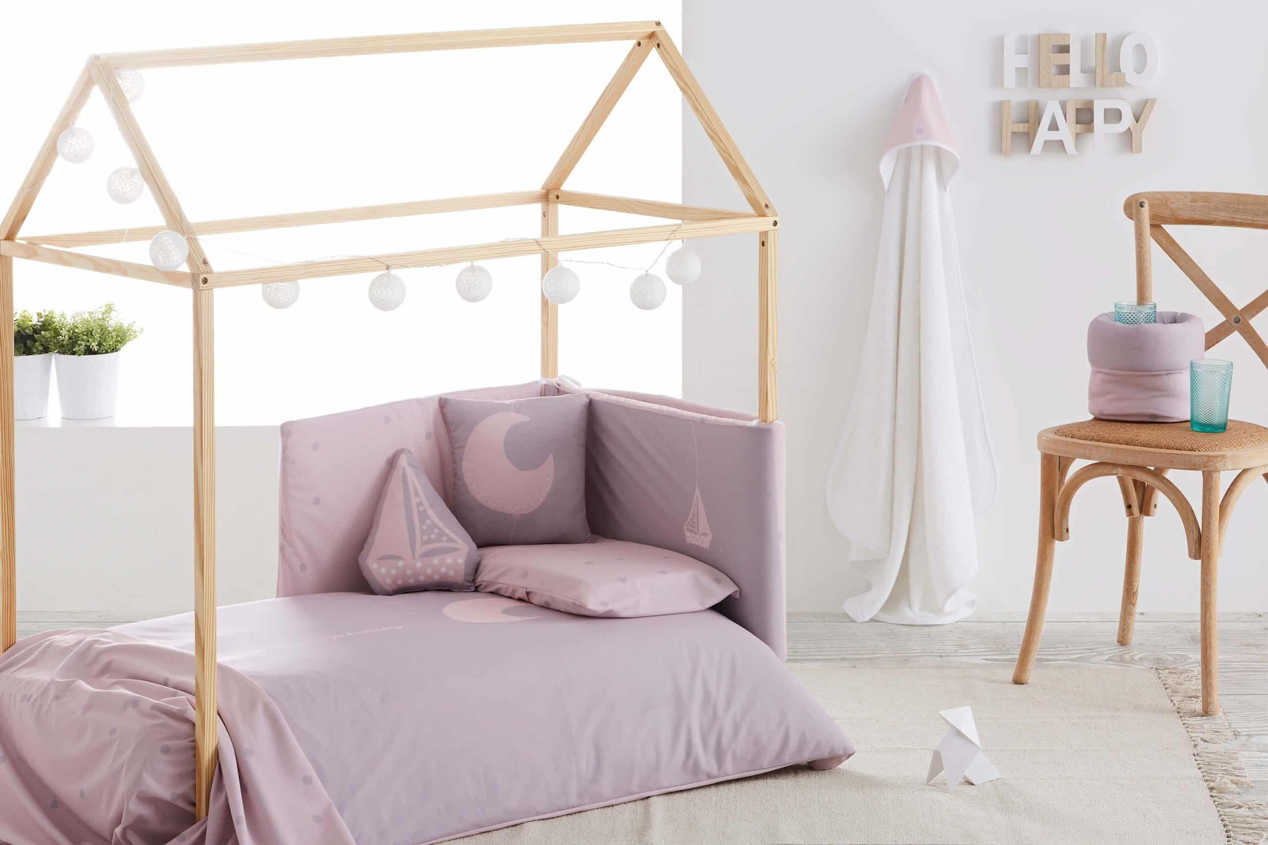 Edredón desenfundable de algodón 100% en color lila combinado con malva perfecto para utilizarlo en verano quitando el relleno y dejando solo la colcha.