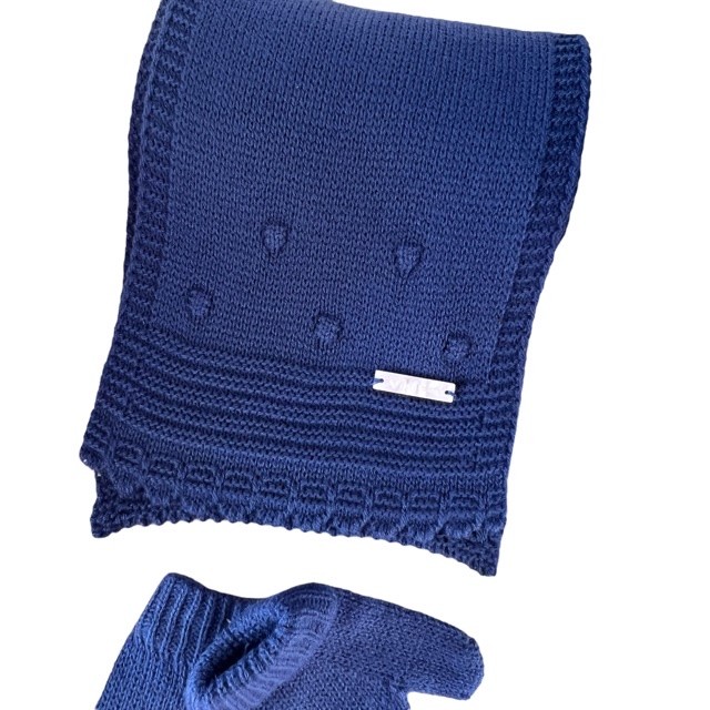 Conjunto de gorro, manopla y bufanda en color azulón.