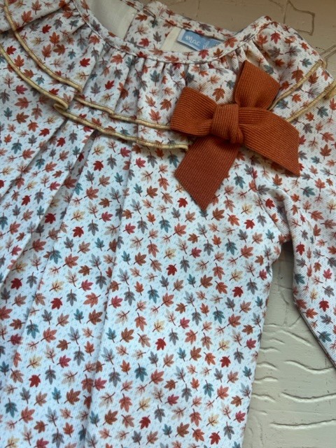 Jesusito 100% algodón cálido de color marfil con estampado de florecitas en color teja y marrón. Detalle volante en el cuello y lazo en el pecho.