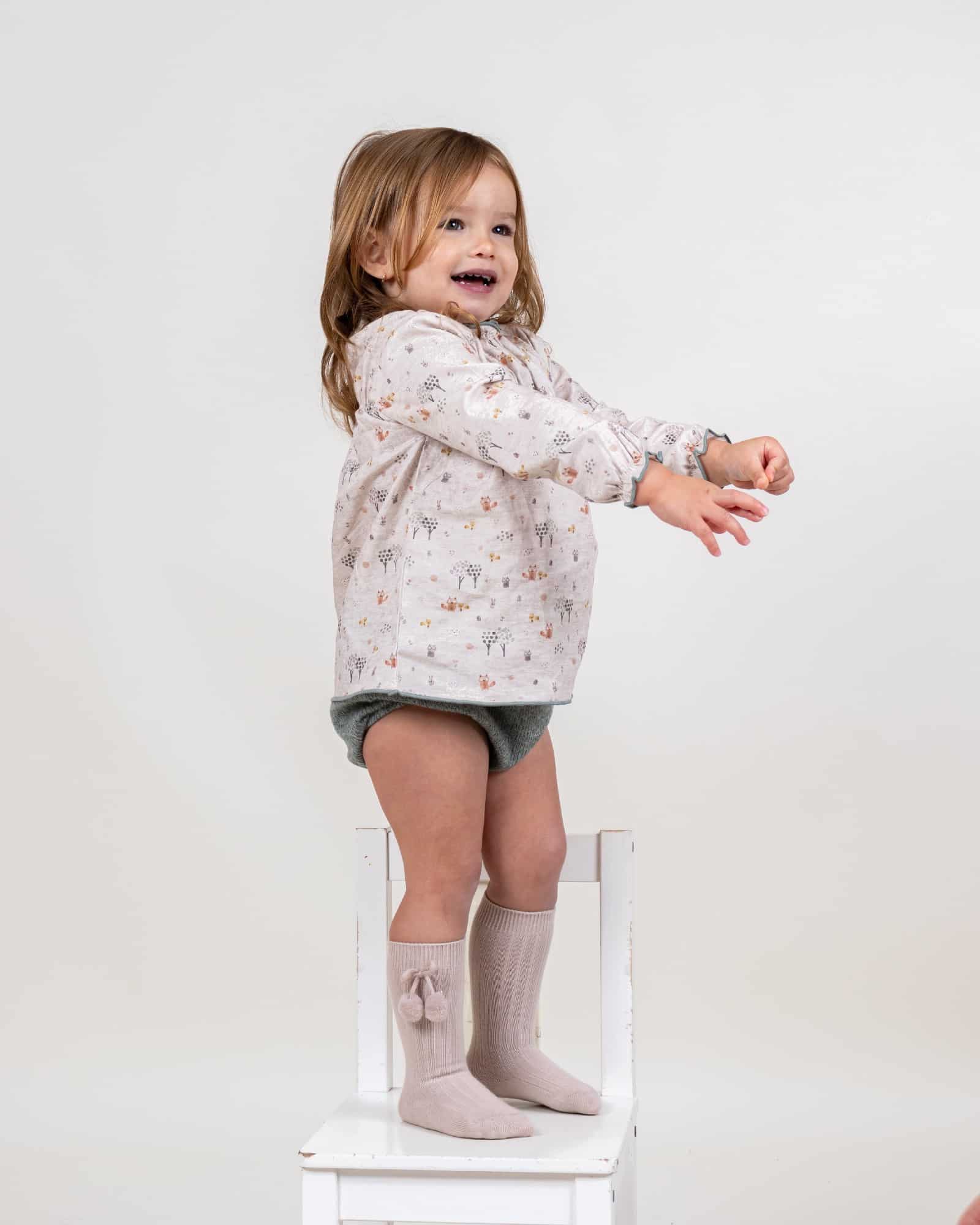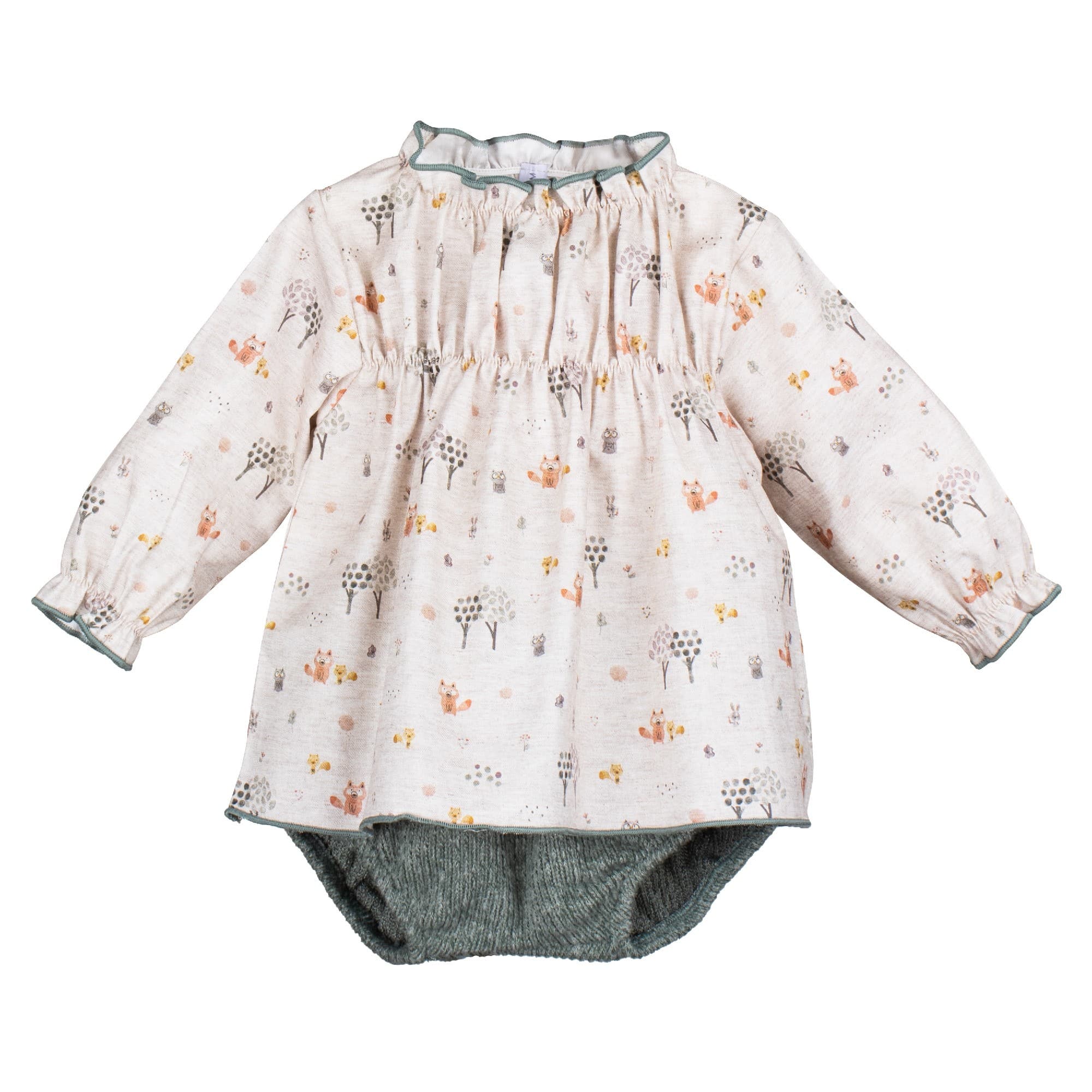 Camisa de color lino con estampado de animalitos. Detalles engomados y volante en el cuello.