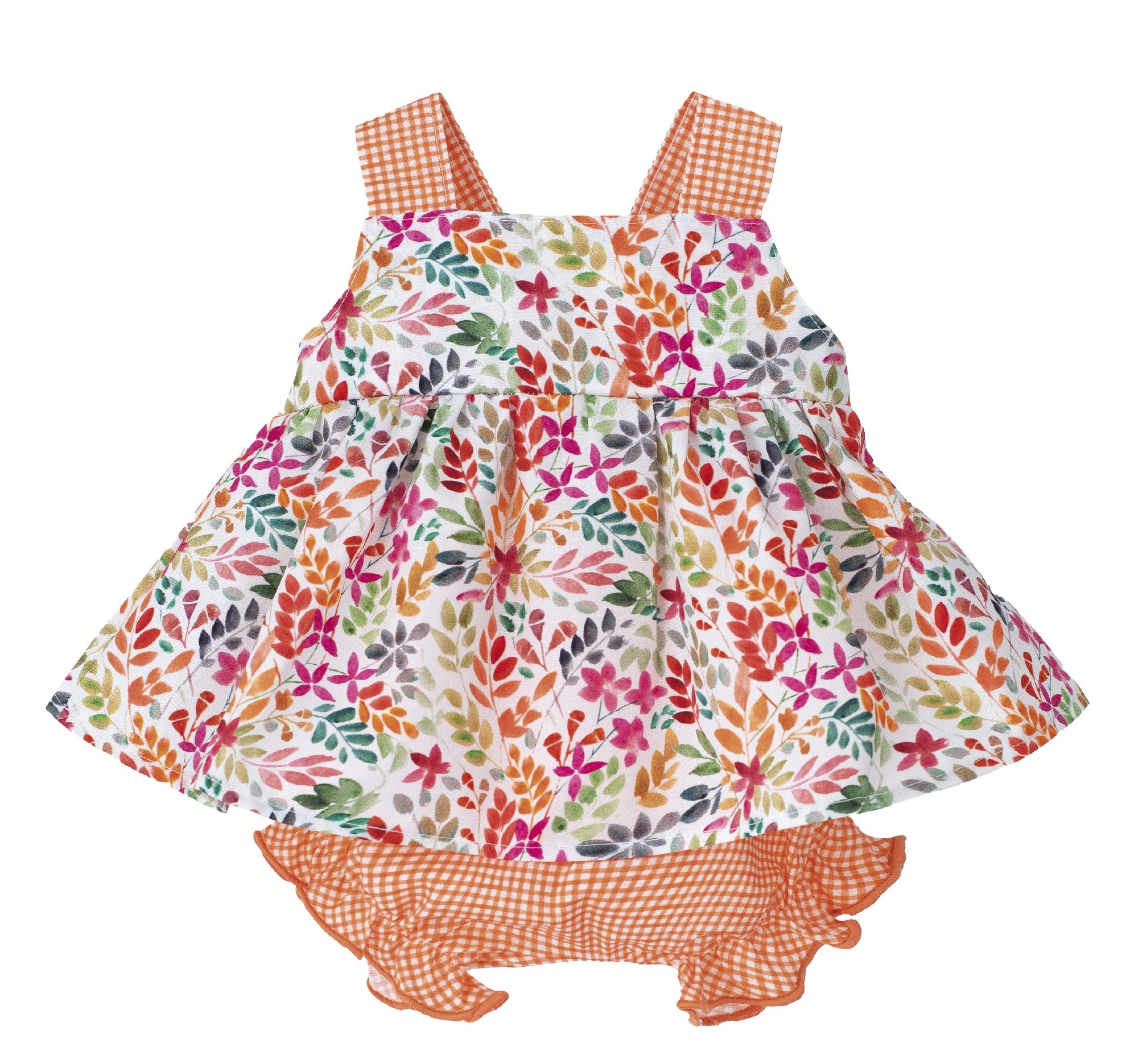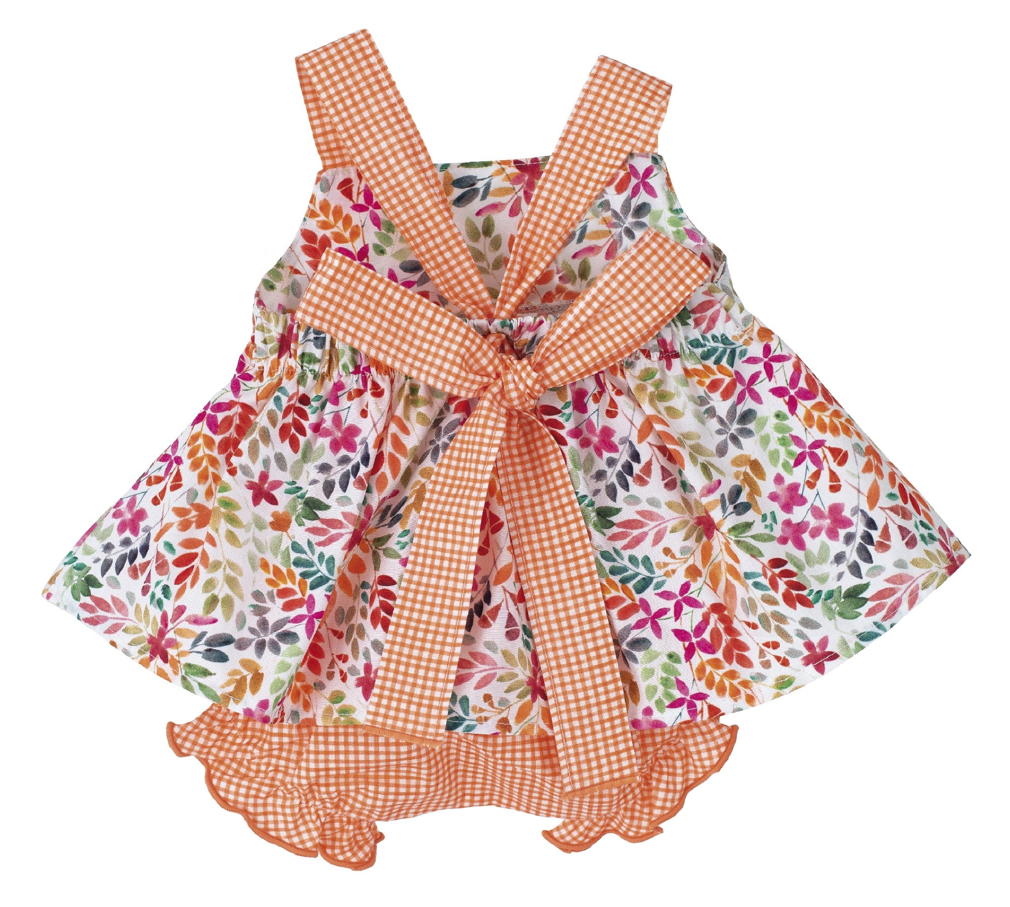 Vestido de tirantes con estampado de flores de colores combinado con tejido de cuadro vichy en color naranja.
