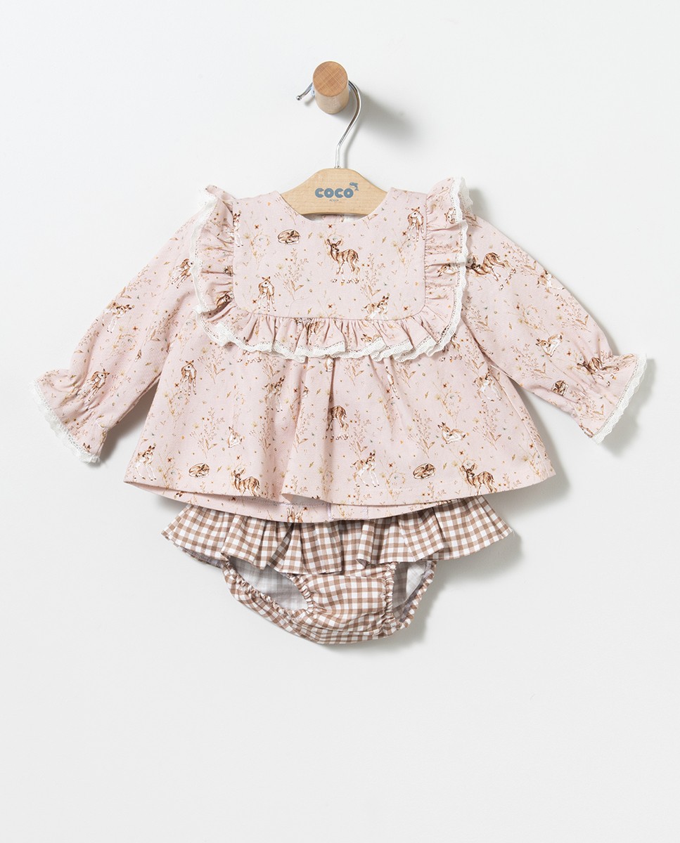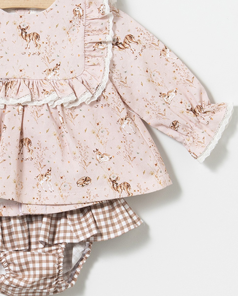 Jesusito de color rosa empolvado con estampado de cervatillos en marrón.