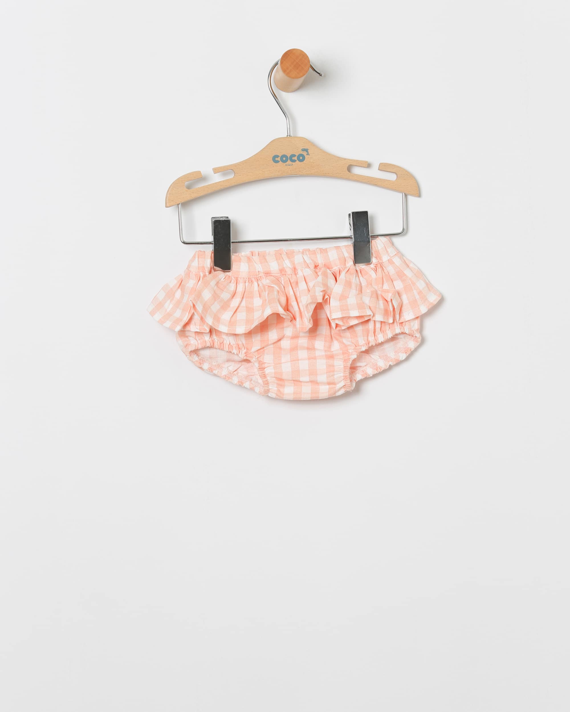 Detalle lazos a los lados con estampado de cuadros en color naranja y blanco.
