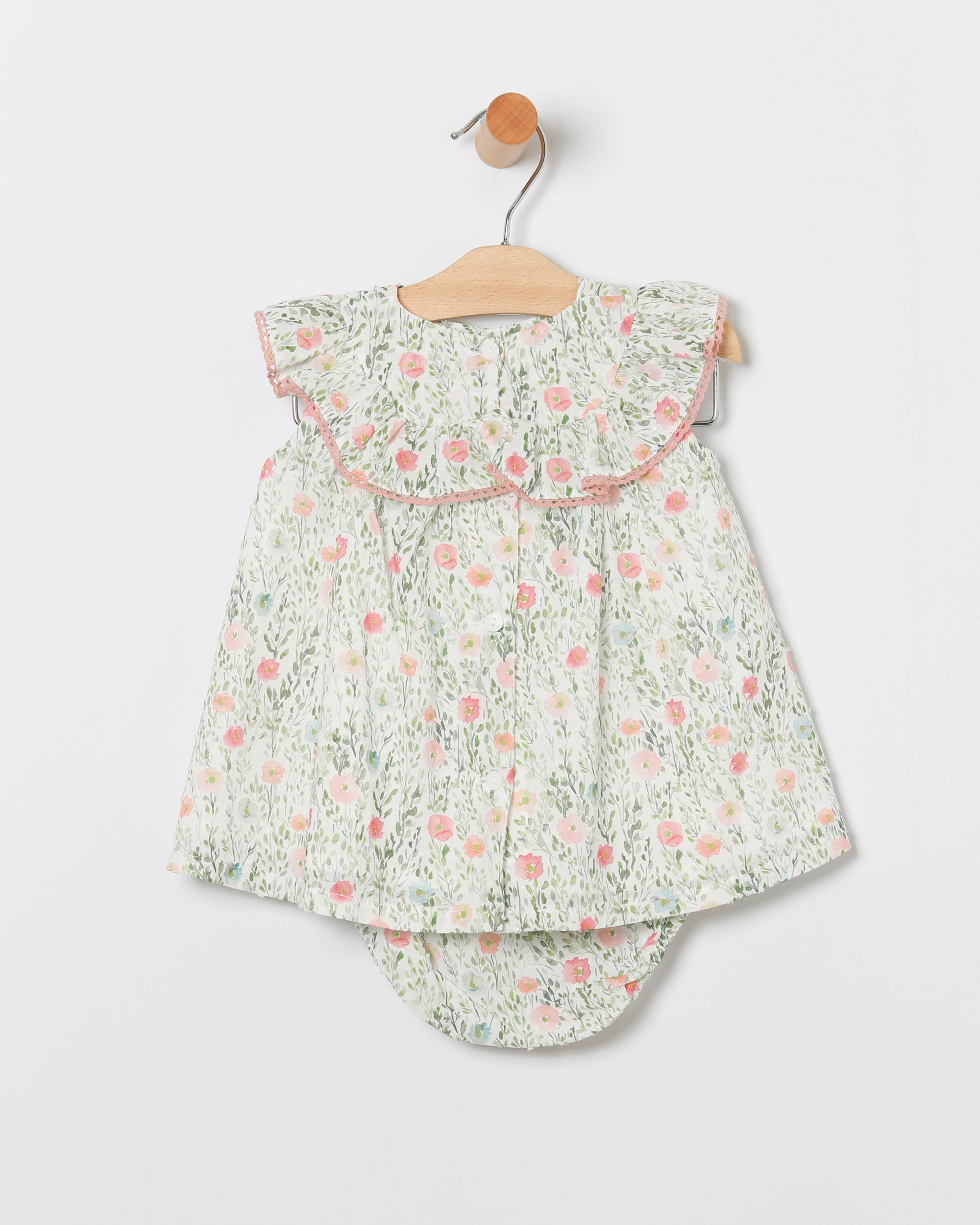 Jesusito con tejido plumeti con estampado de flores en color verde y rosa.