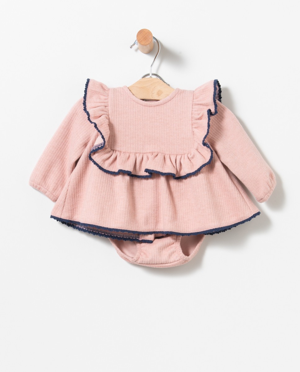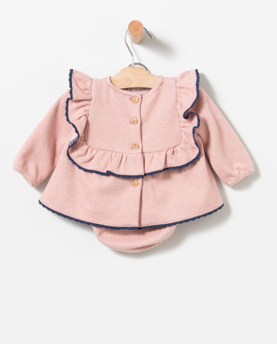 Jesusito de color rosa empolvado con detalle volantes en azul marino.