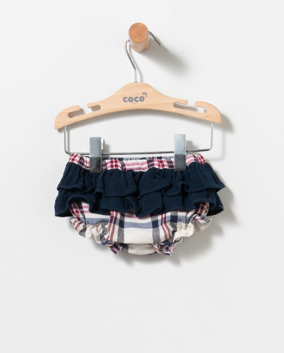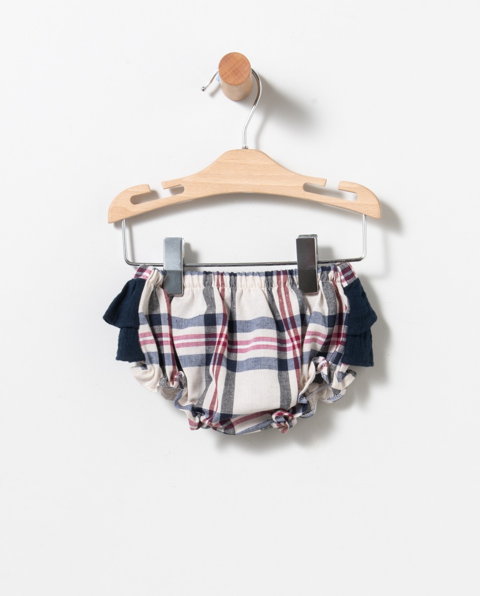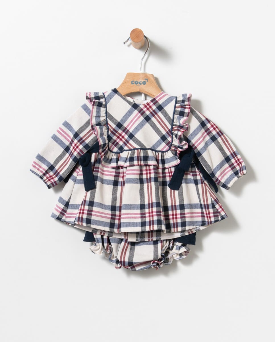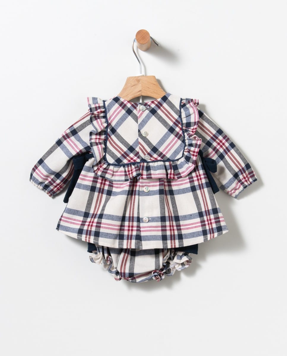 Jesusito con estampado de cuadros en color azul marino y granate. Detalle volantes en el pecho y dos lazos a los lados en color azul marino.