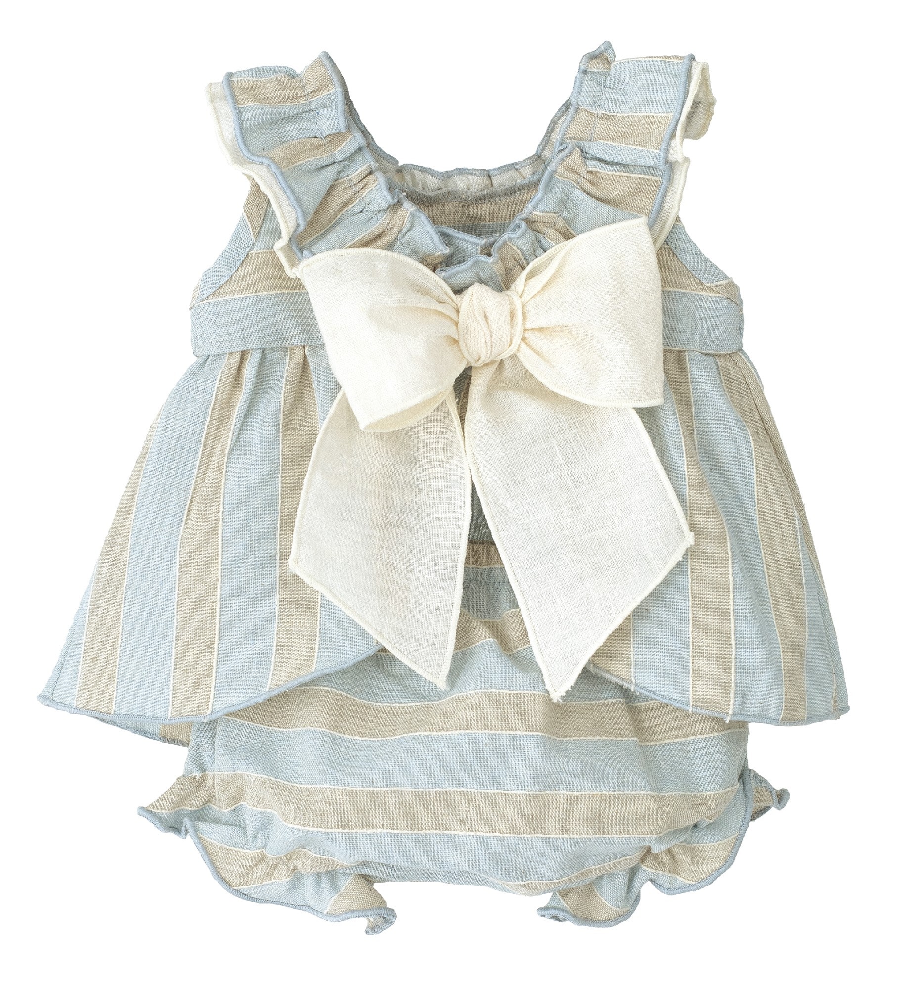 Jesusito de bebé en tejido de lino con un delicado estampado de rayas en tonos beige y azul empolvado.