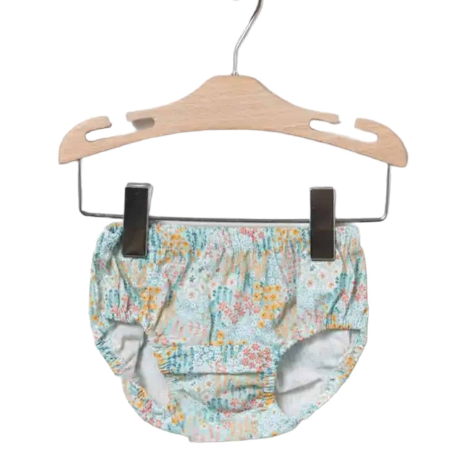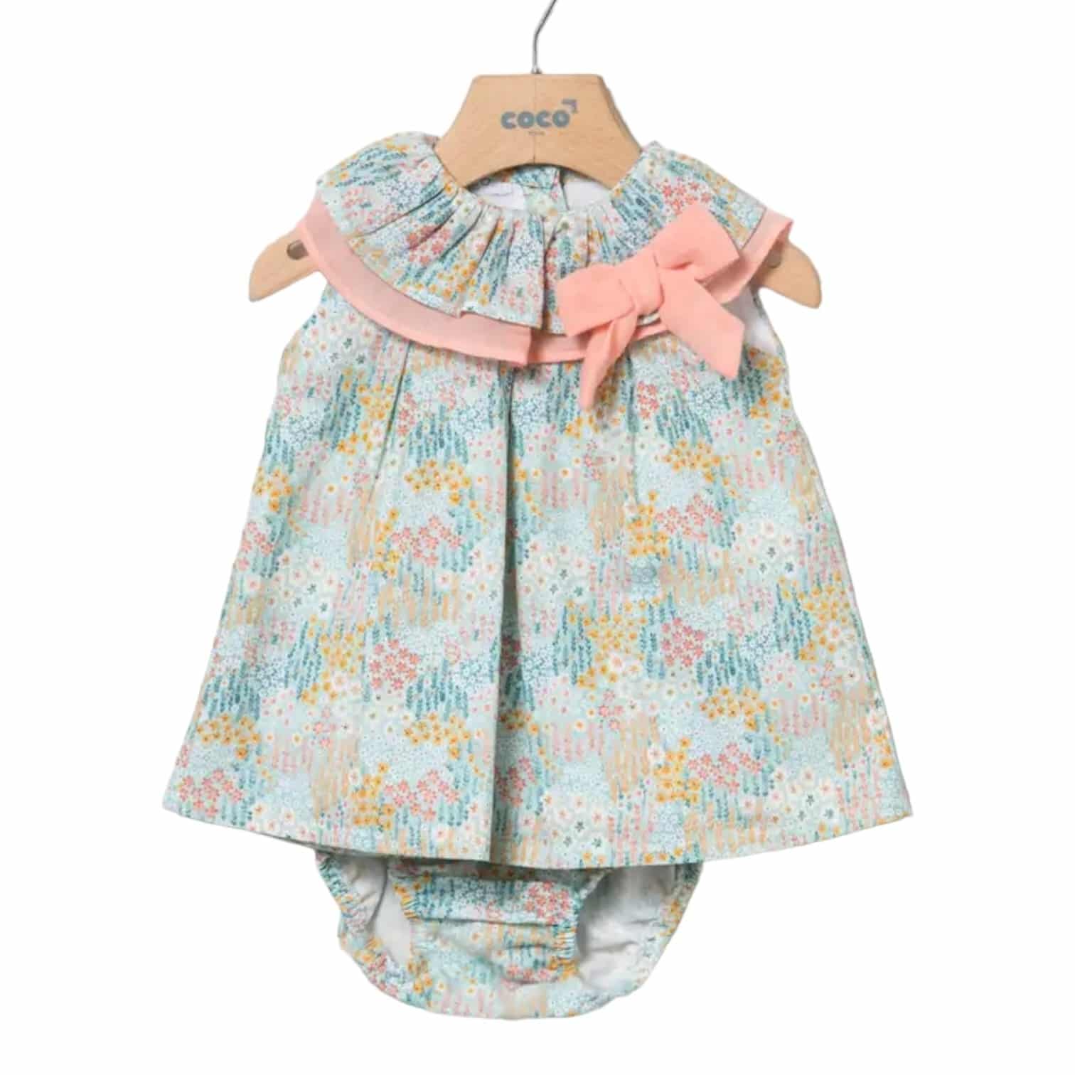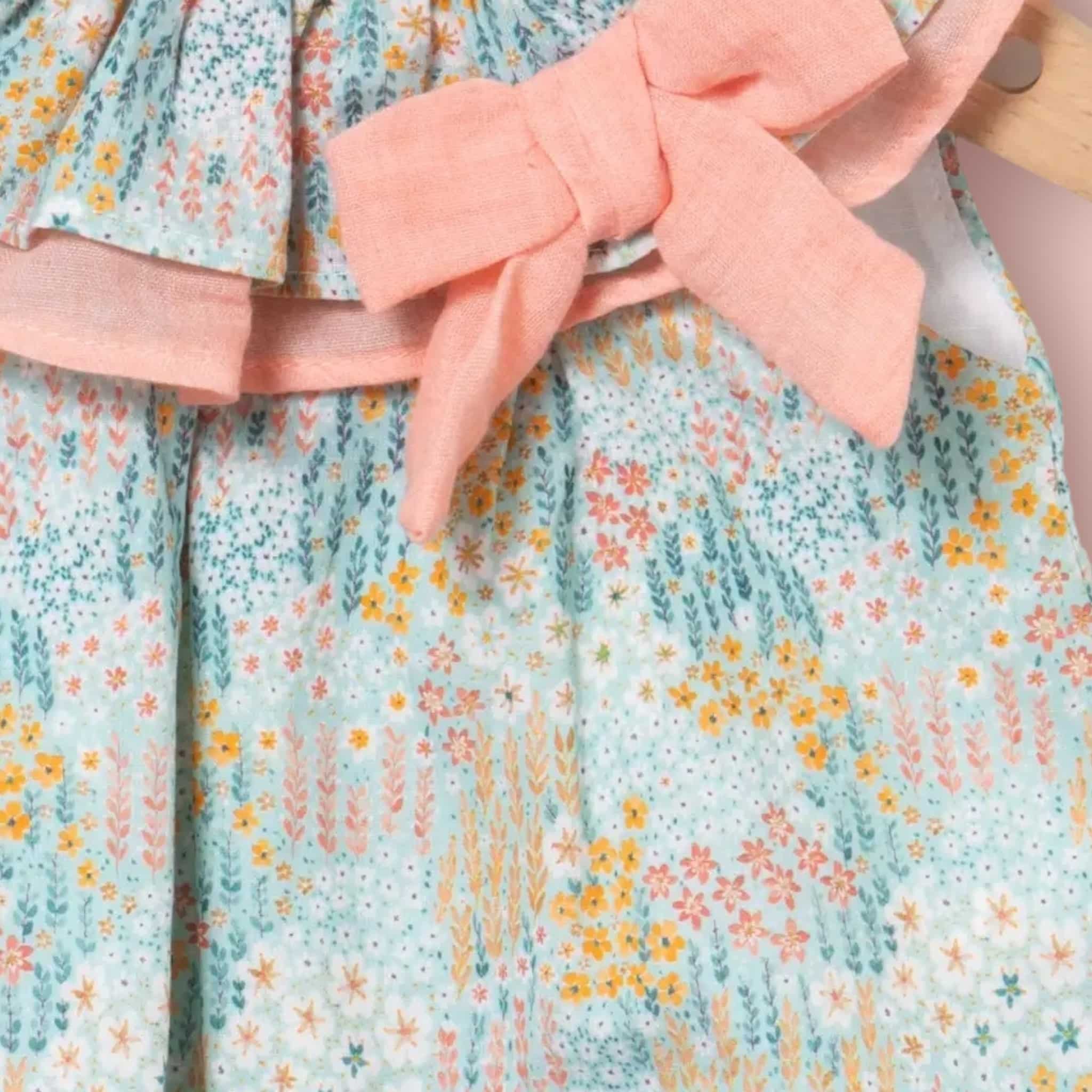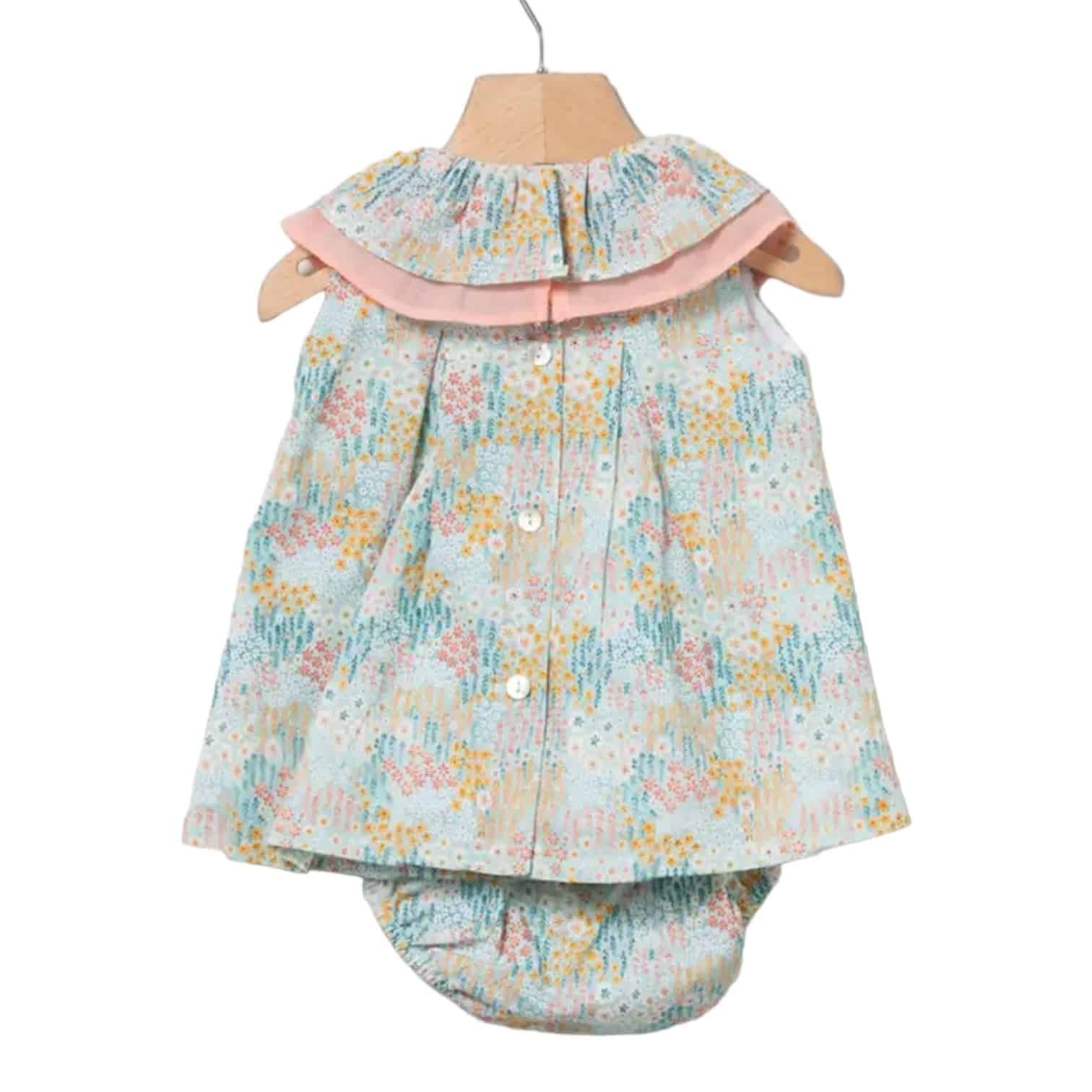 Jesusito desmangado de color azul celeste con estampado de florecitas en color salmón.