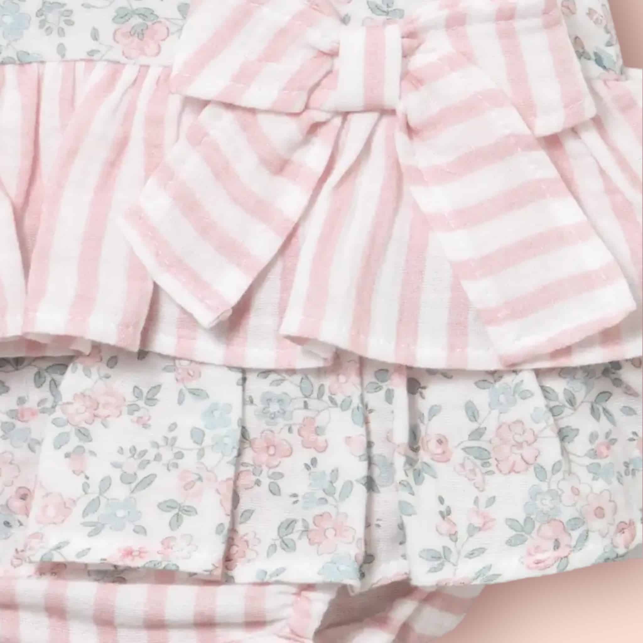 Jesusito de color blanco con estampado de flores en tonos pastel. Detalle volantes y lazo a rayas rosas.