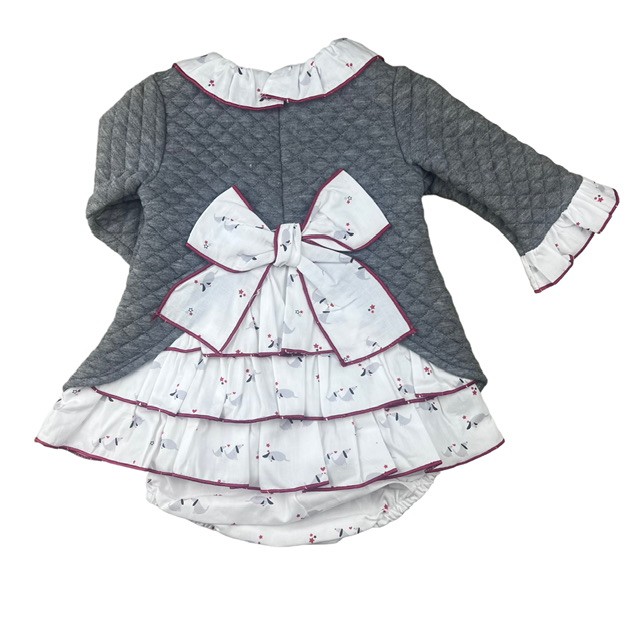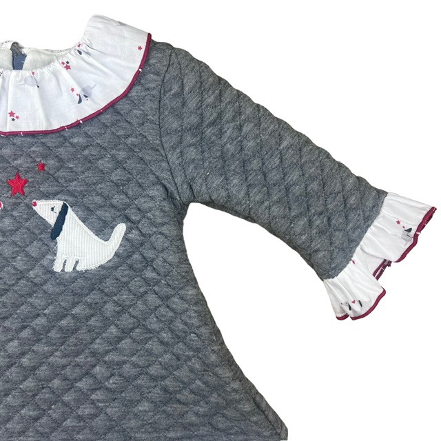 Vestido 100% algodón de color gris con rombos bordados. Detalle volante en mangas, cuello y parte trasera con estampado de perritos.