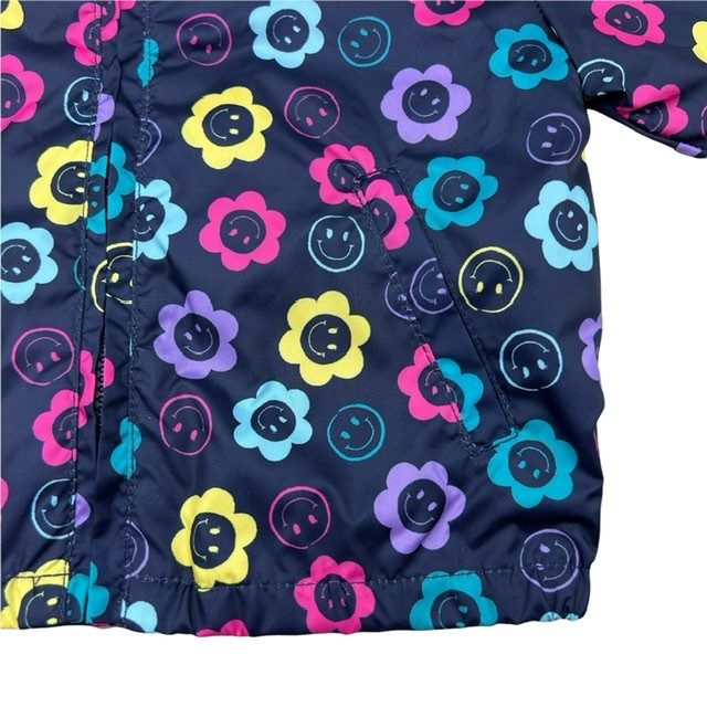 Chaqueta cortavientos de color azul marino con dibujo margaritas de colores. Apertura con cremallera en la parte delantera, capucha y forro interior.