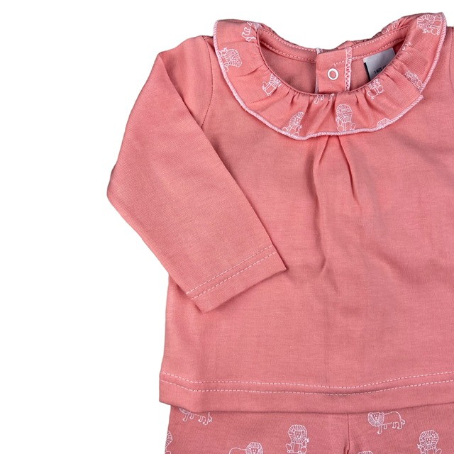 Muda de algodón 100% en color naranja con dibujo leones en blanco. Detalle cuello volante.