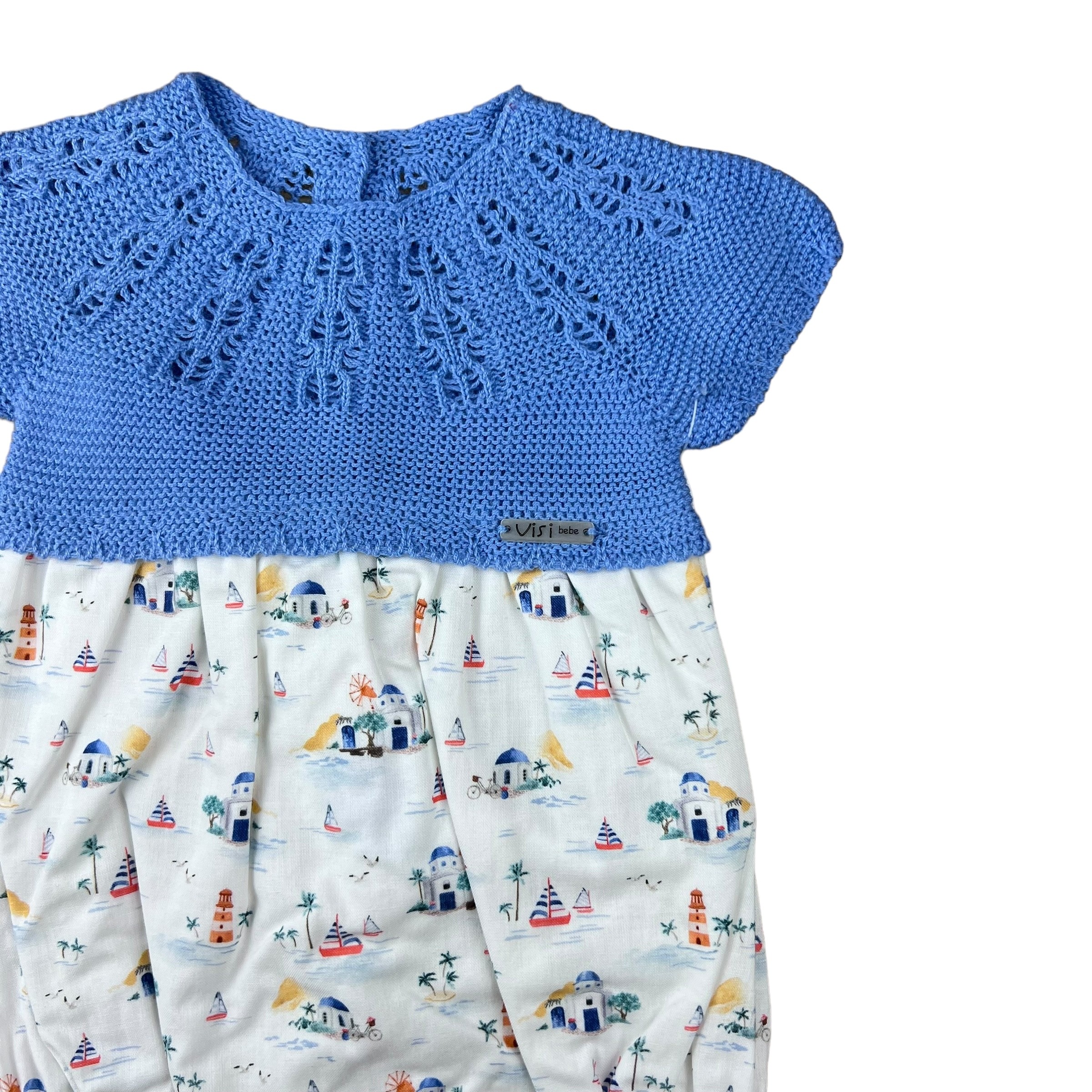 Pelele de hilo combinado con estampado de barquitos en color azul francia y blanco. Apertura en la parte trasera e inferior.