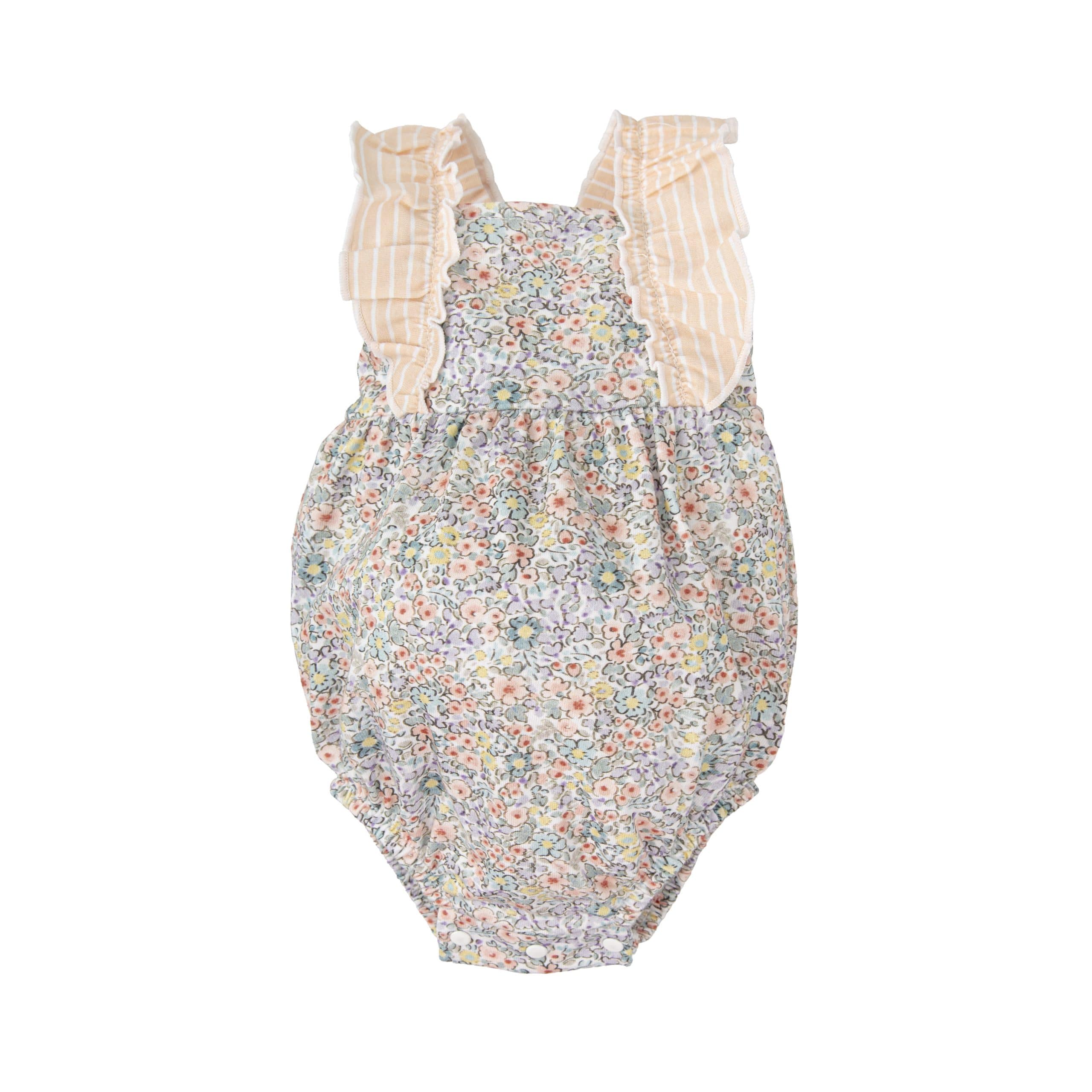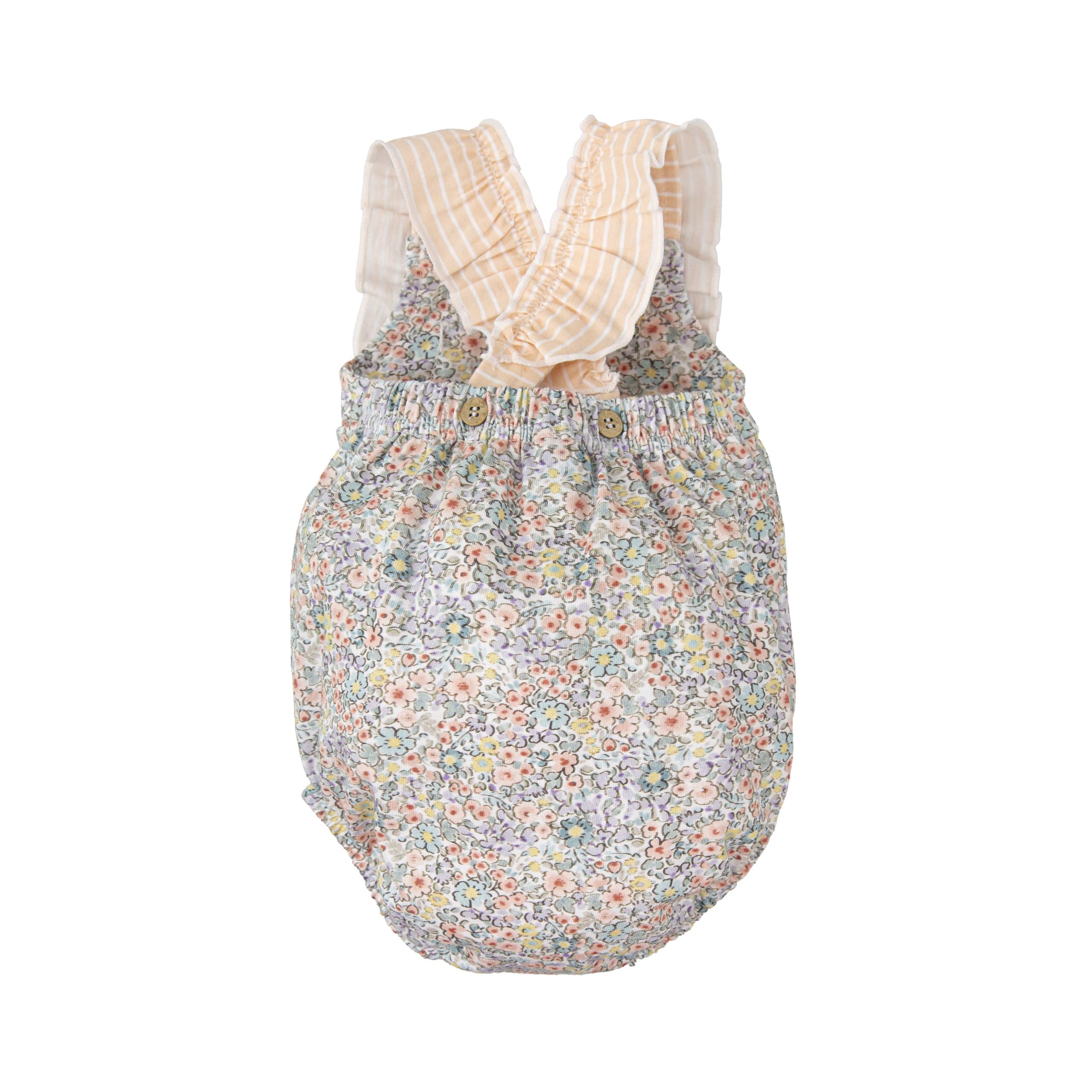 Pelele 100% algodón con estampado de flores en color azul y salmón.