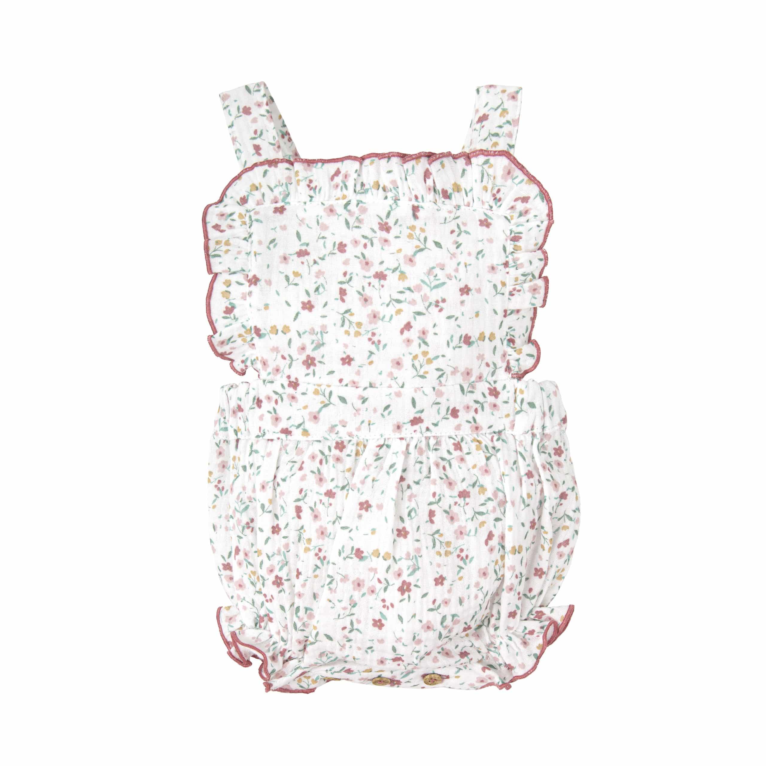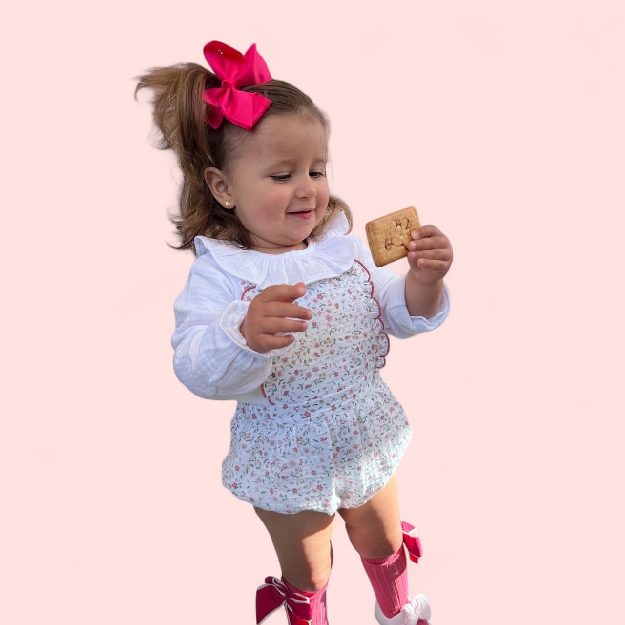 Peto con tejido bambula en color blanco. Estampado de flores en fucsia.
