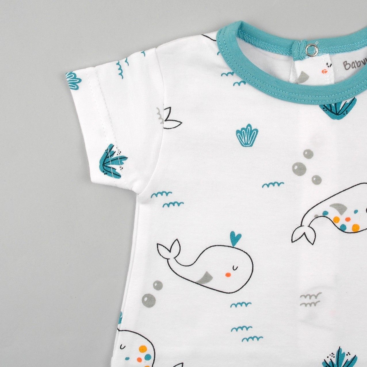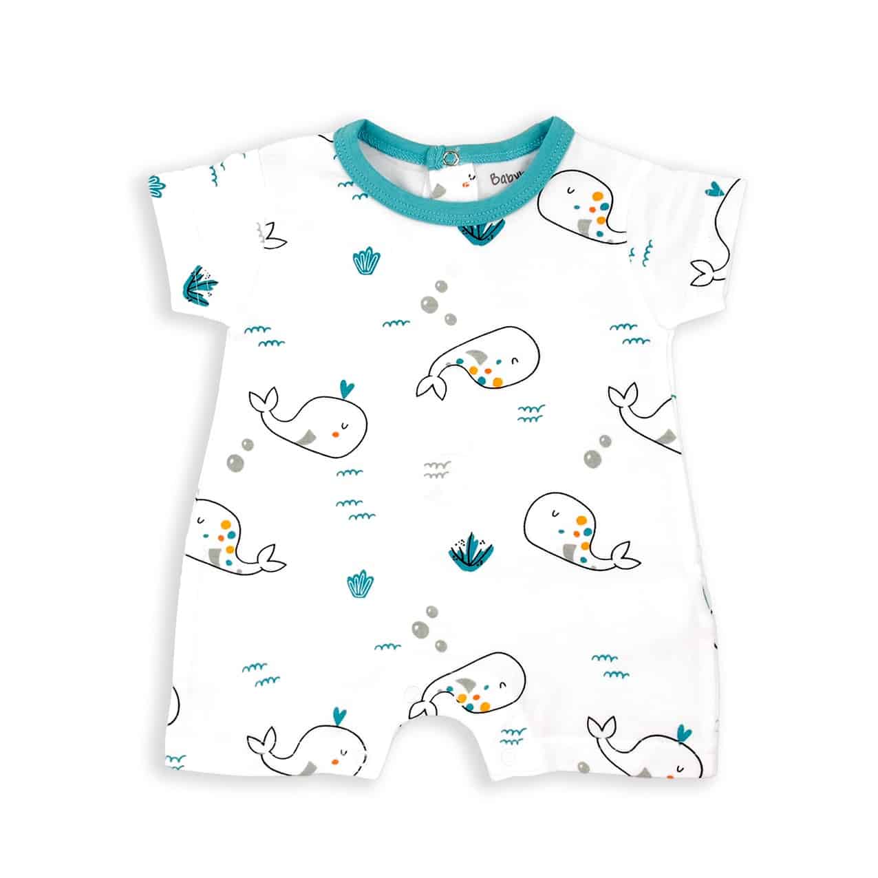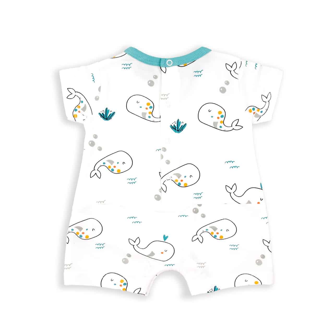 Pelele 100% algodón de color blanco y azul con estampado de ballenas. Apertura completa con corchetes automáticos en la parte delantera e inferior.