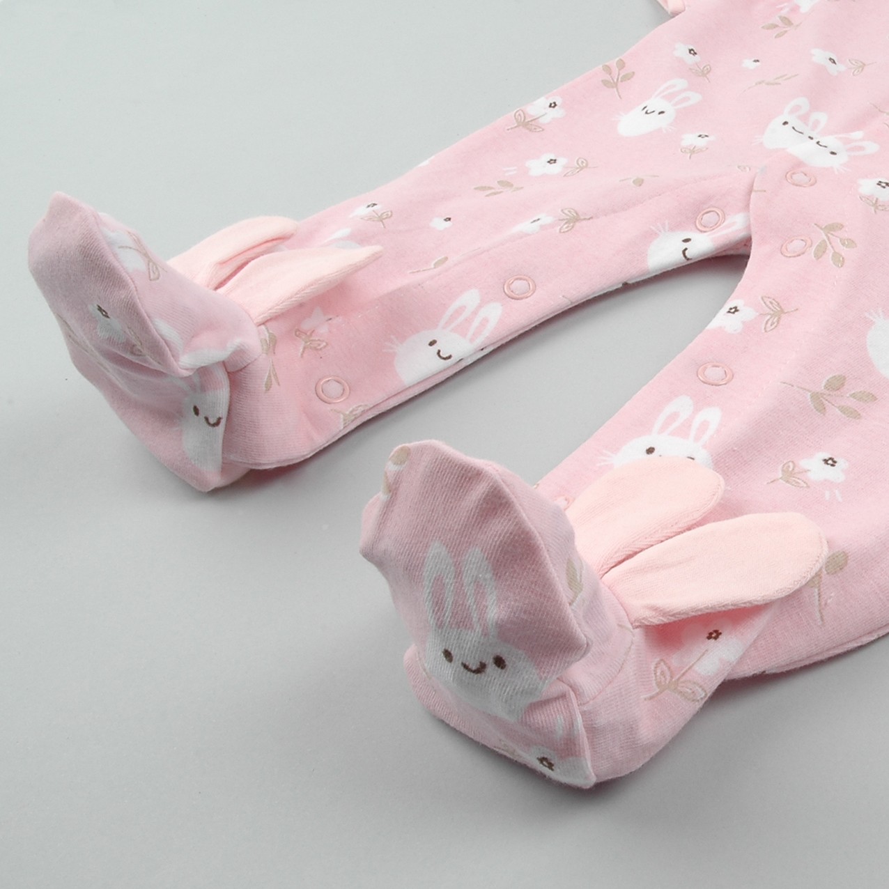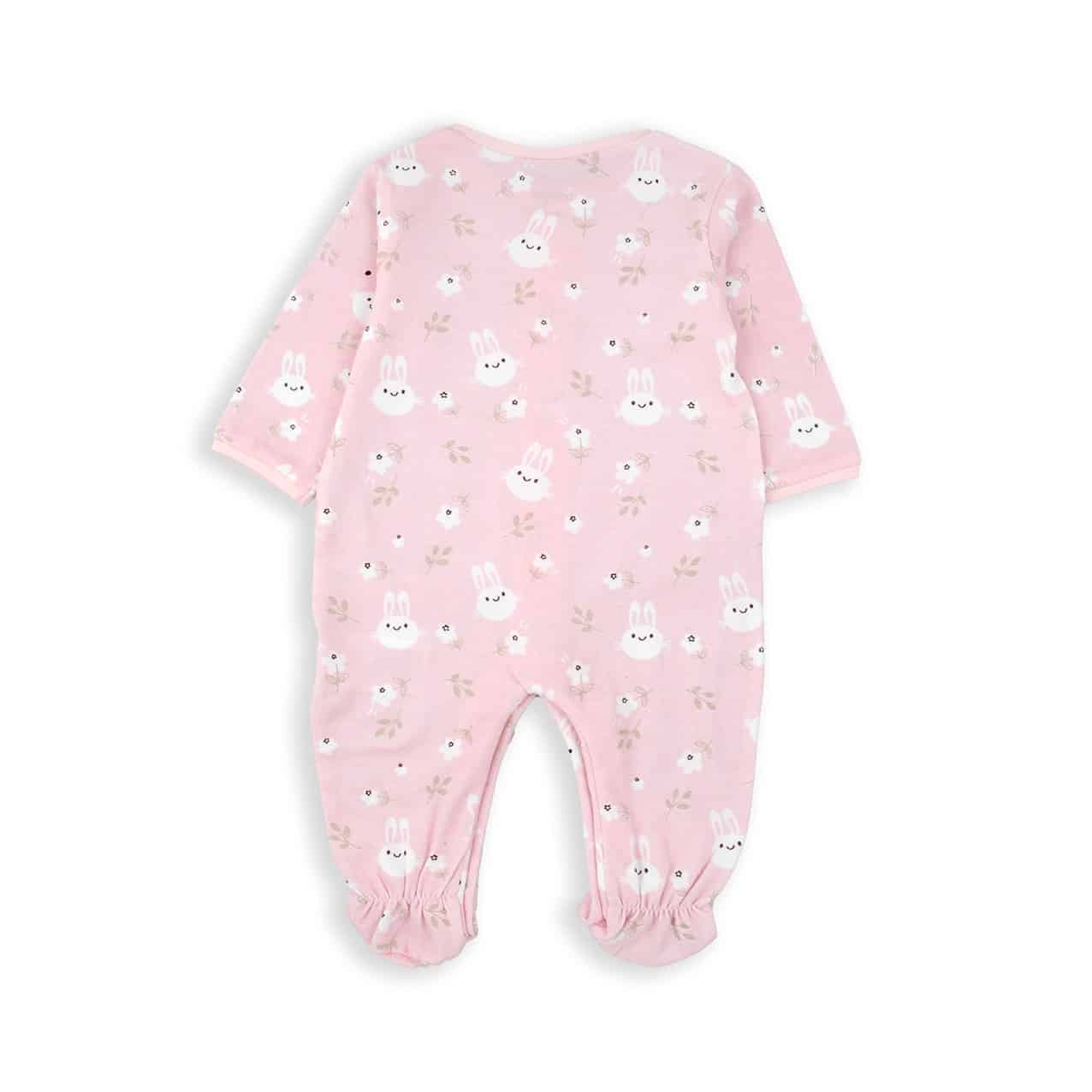 Pelele 100% algodón de color rosa bebé con estampado de conejitos.