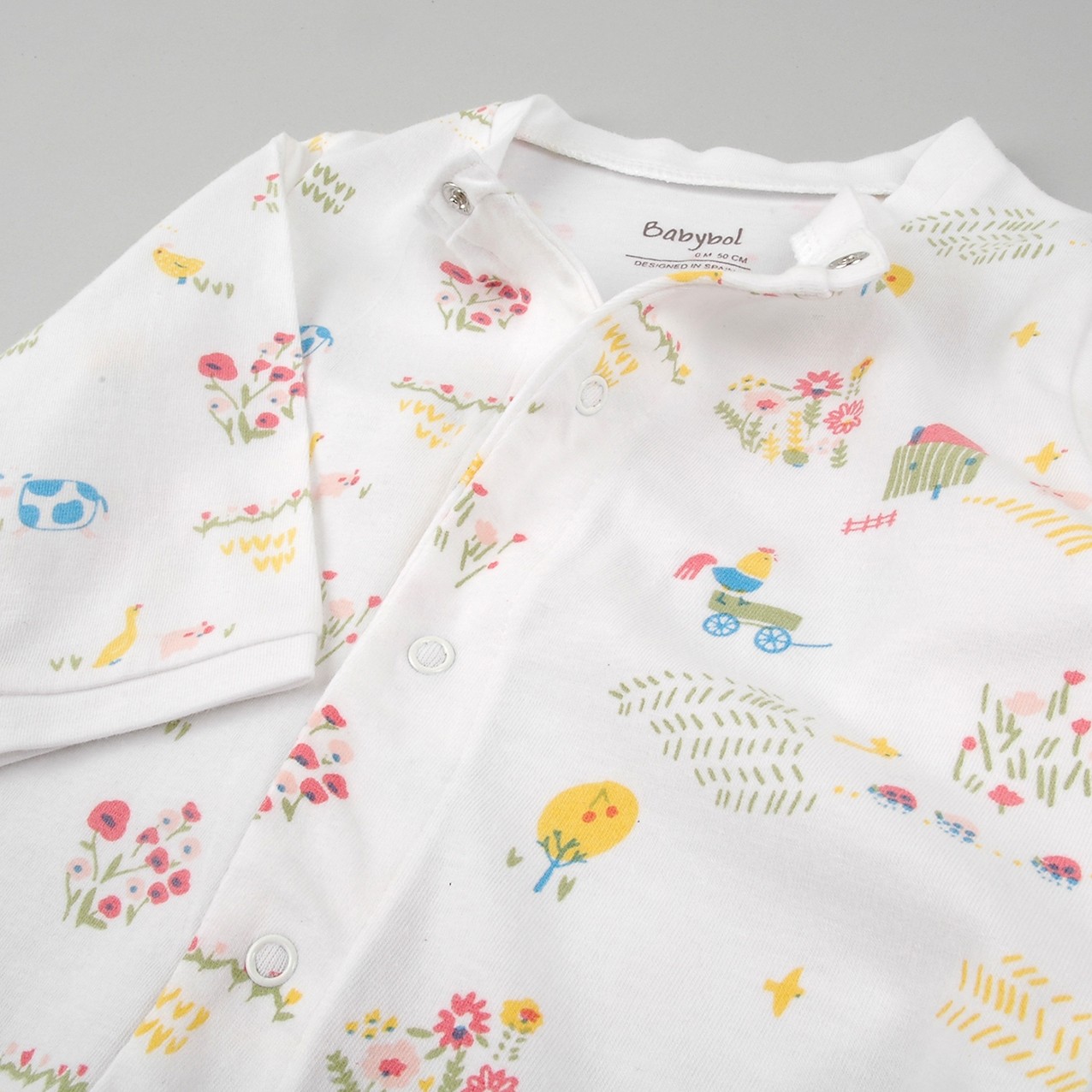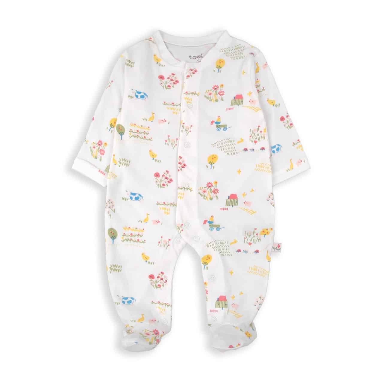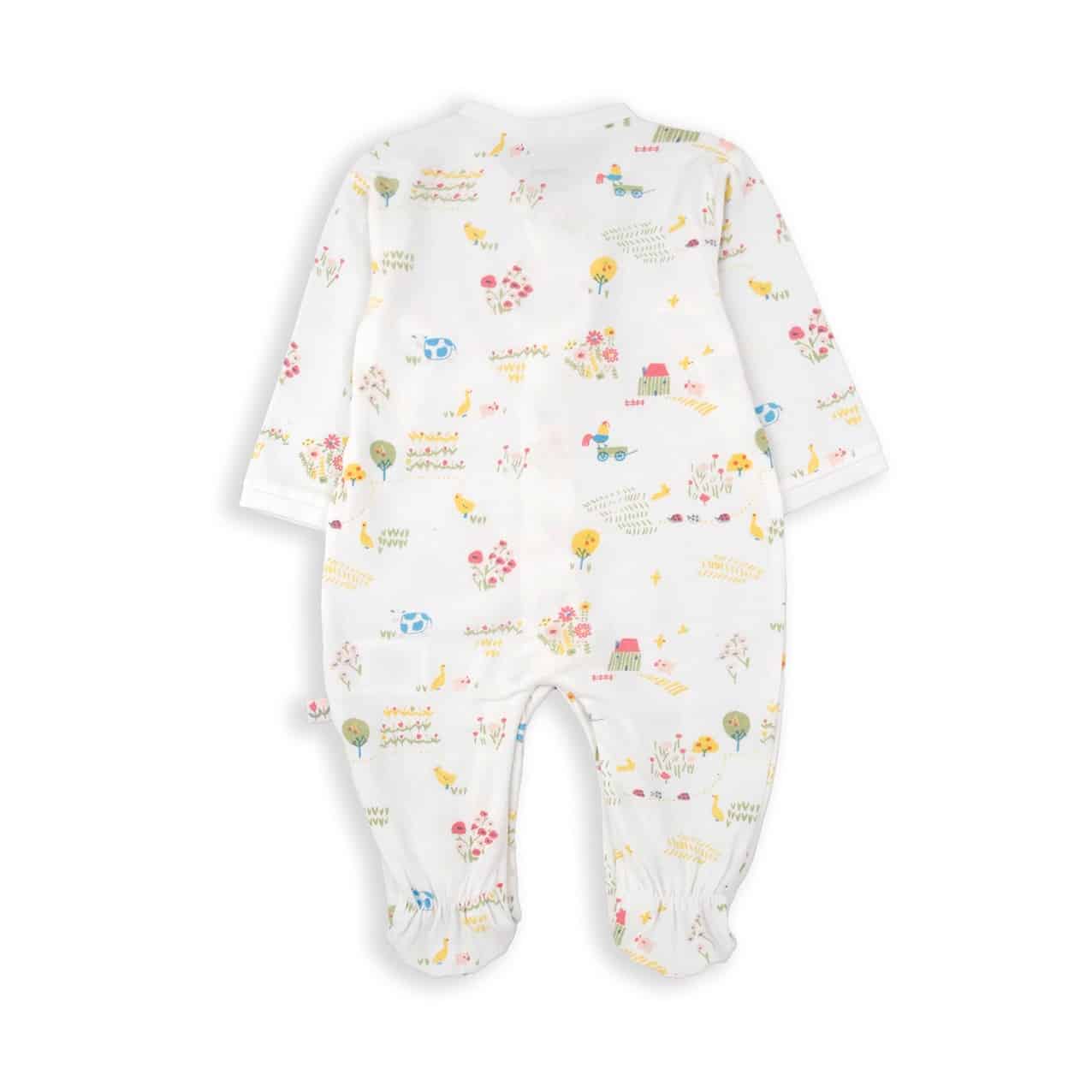 Pelele 100% algodón con estampado de flores y casitas. Apertura completa con corchetes automáticos en la parte delantera e inferior.