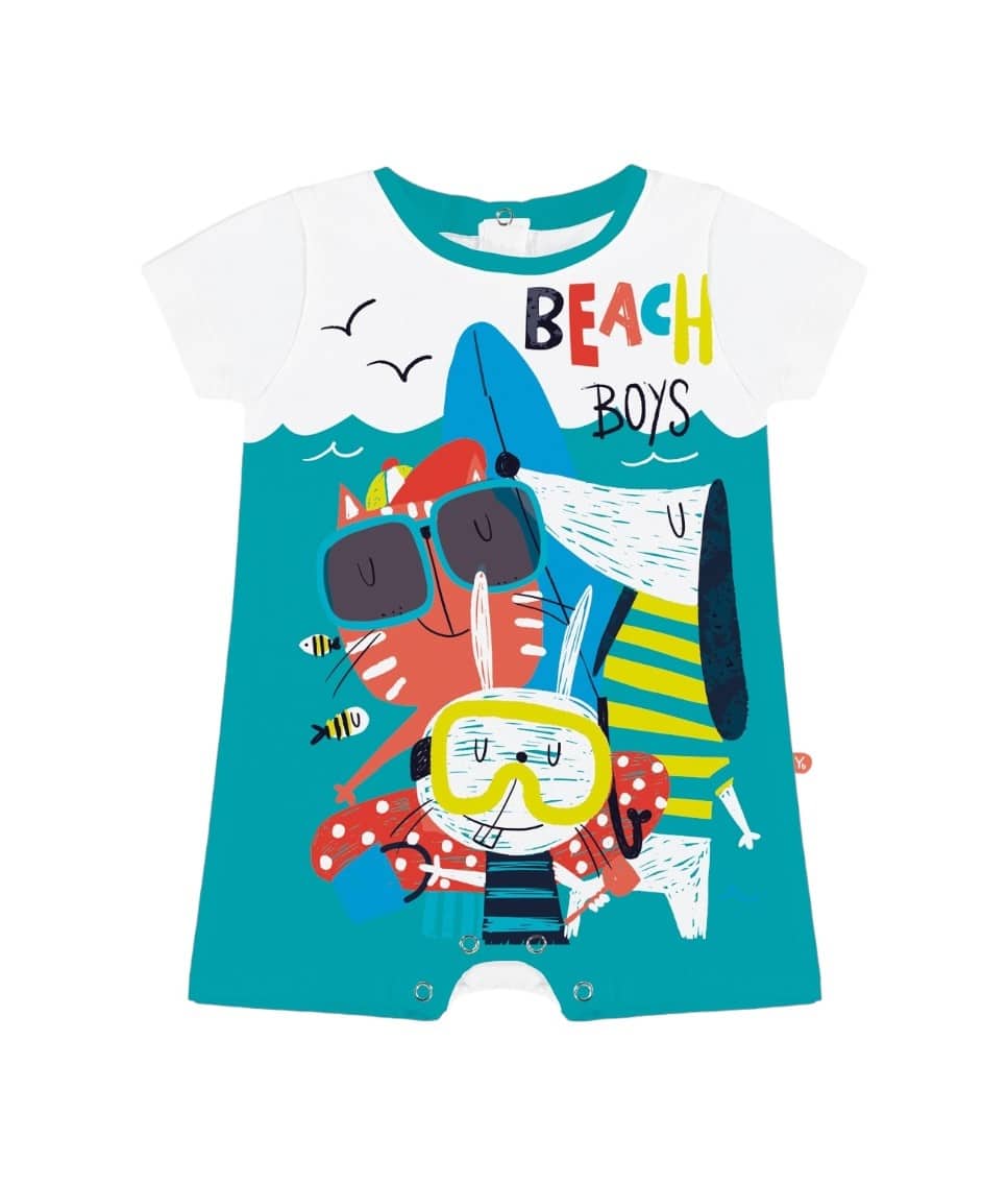 Pelele de color blanco y azulón con estampado animales.