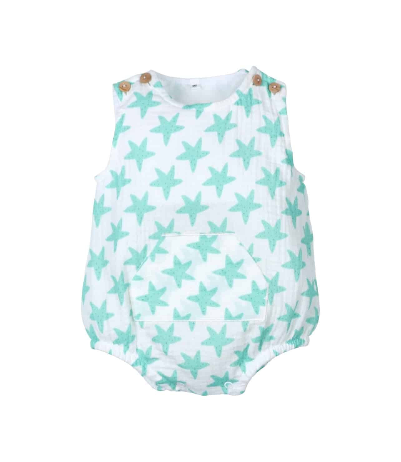 Pelele con tejido bambula en color blanco con estampado de estrellas en verde agua. Detalle bolsillo en la parte delantera.