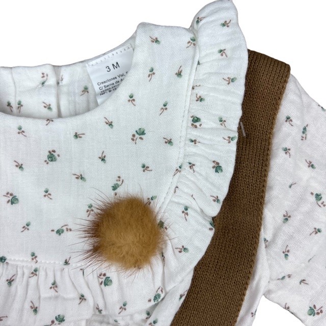 Camisa bambula de color blanco con estampado de florecitas en tonos verde. Detalle pompón de pelo en el pecho y volantes.