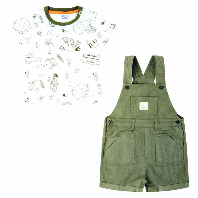 Peto de color caqui con bolsillos decorativos. Apertura en los tirantes y la parte inferior.