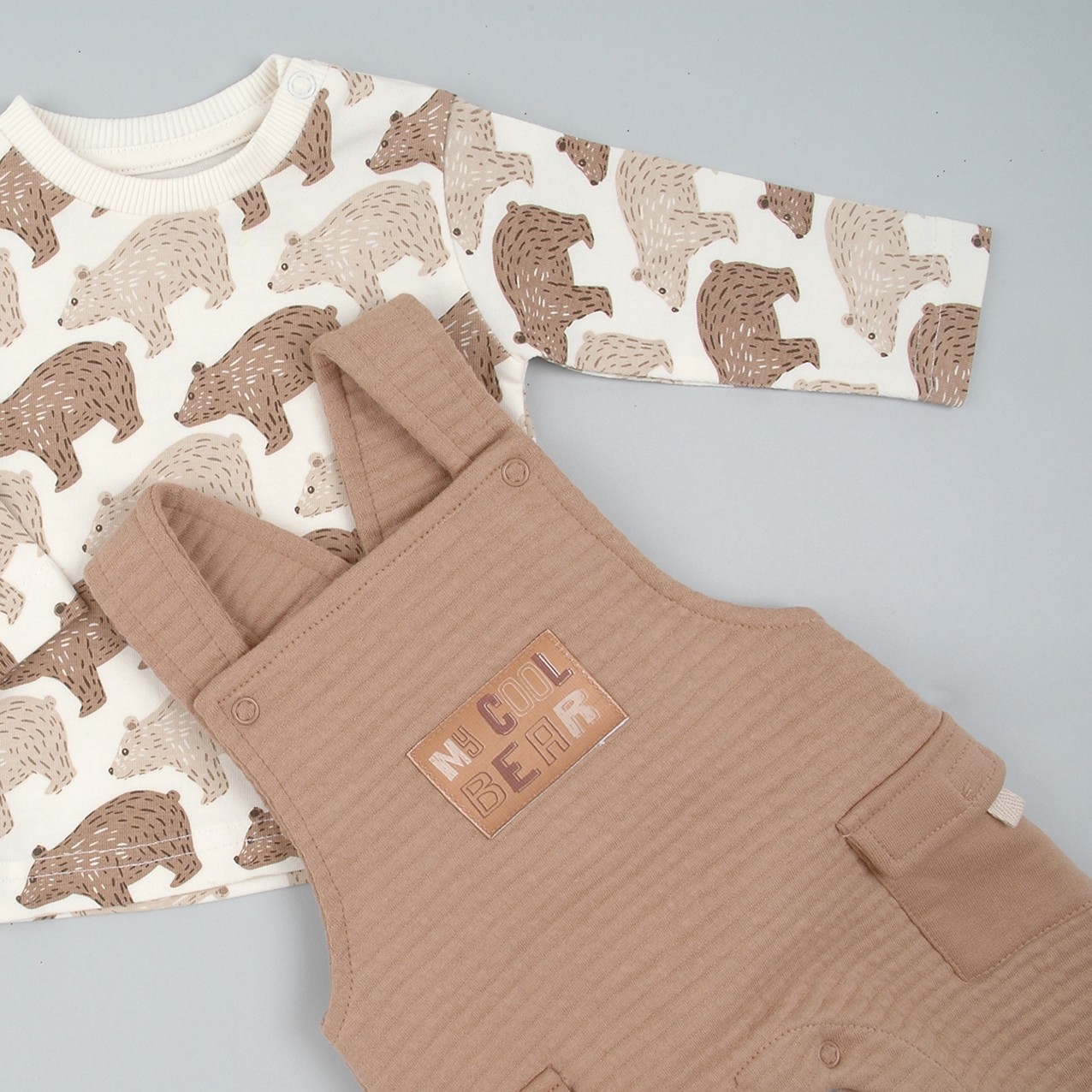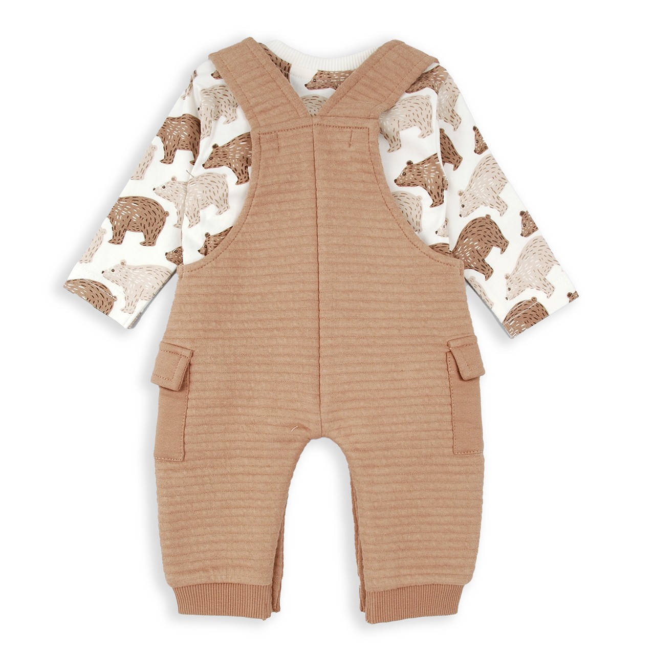 Peto 100% algodón en color marrón con tejido acolchado. Detalle bolsillos cargo. Apertura en los tirantes y la parte inferior.
