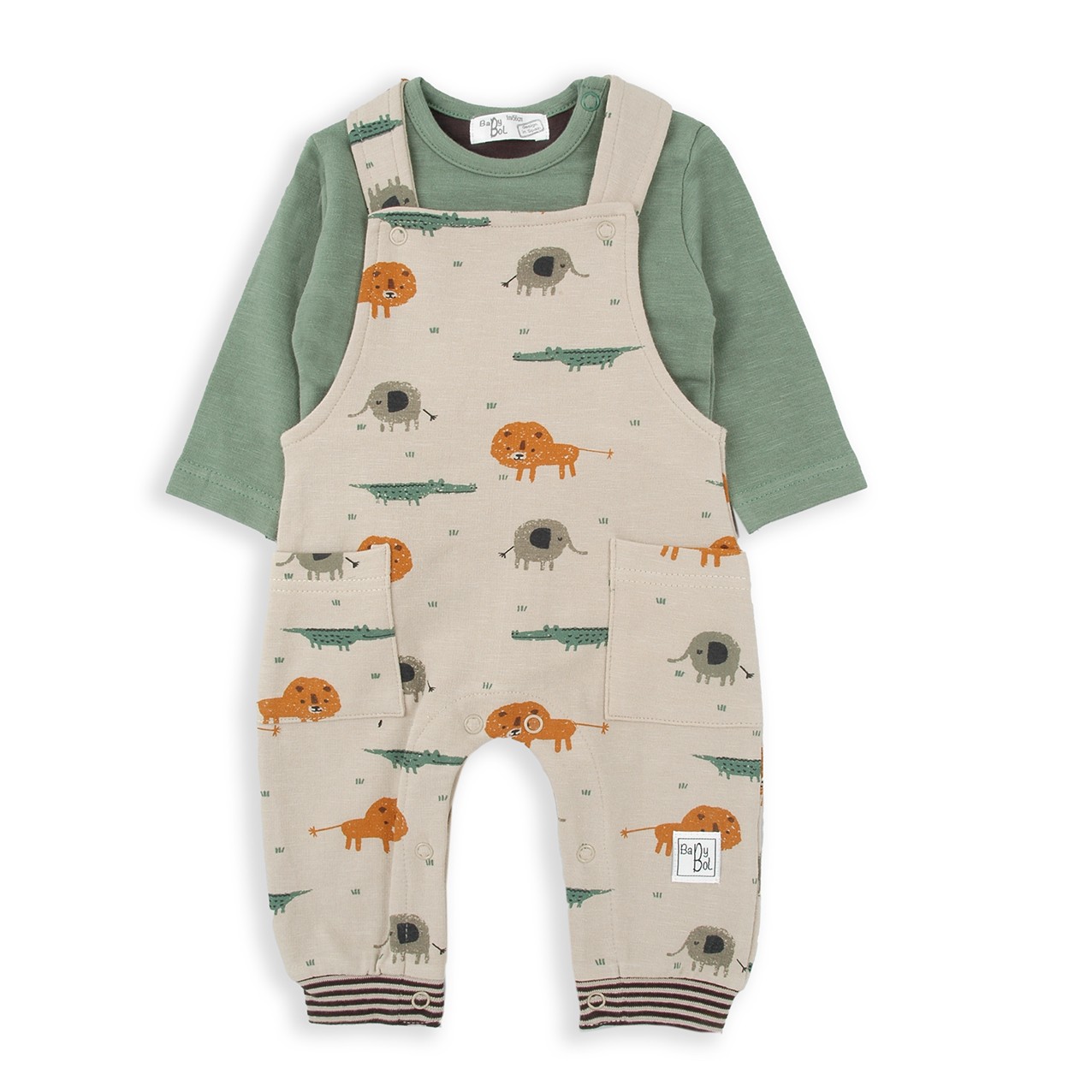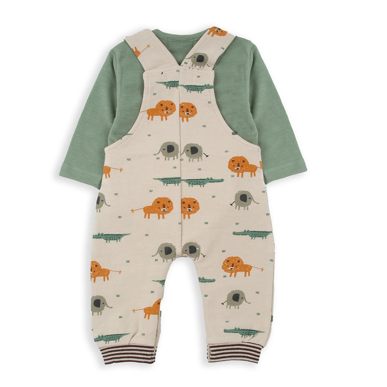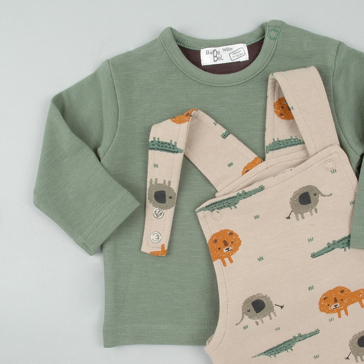 Peto y camiseta 100% algodón de color caqui y beig. Estampado de animales en tonos naranjas.