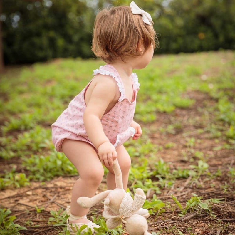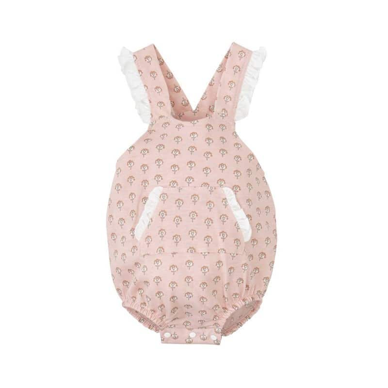 Peto 100% algodón en color rosa empolvado y estampado flores. Apertura en los tirantes y la parte inferior.