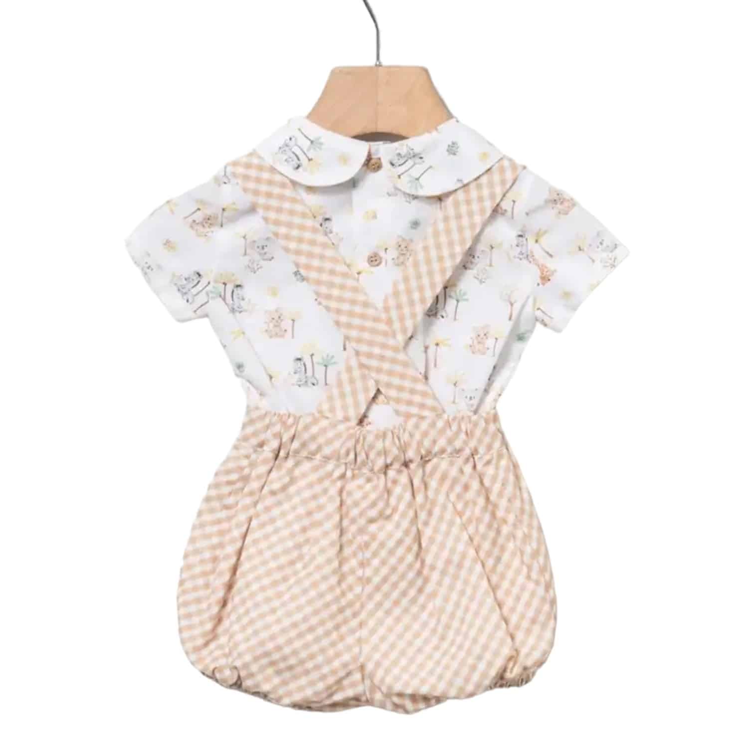 Camisa con cuello bebé de color blanco con estampado de animalitos. Apertura en la parte trasera con botones.