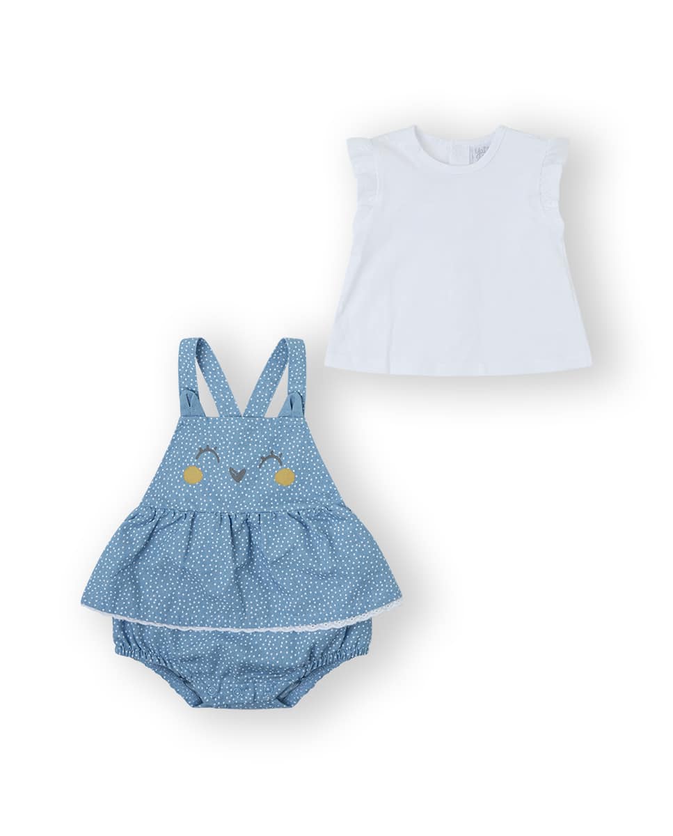 Peto vaquero con volante de color azul y estampado de topitos.
