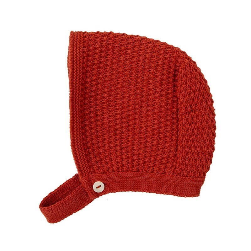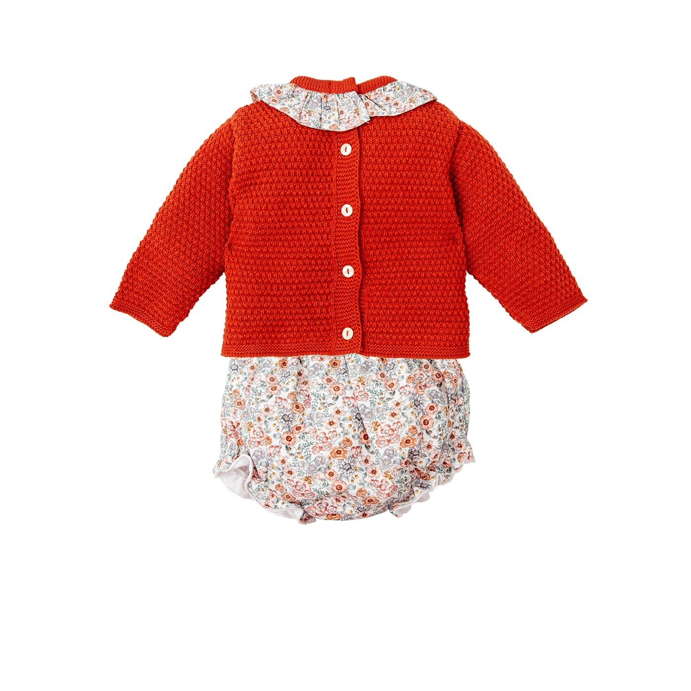 Jersey de punto en color granate con detalle cuello volante estampado. Con estampado de flores y capota a juego.