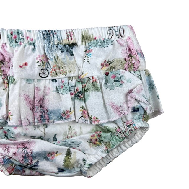 Ranita de color blanco con estampado de bicis y flores rosas. Detalle volante.