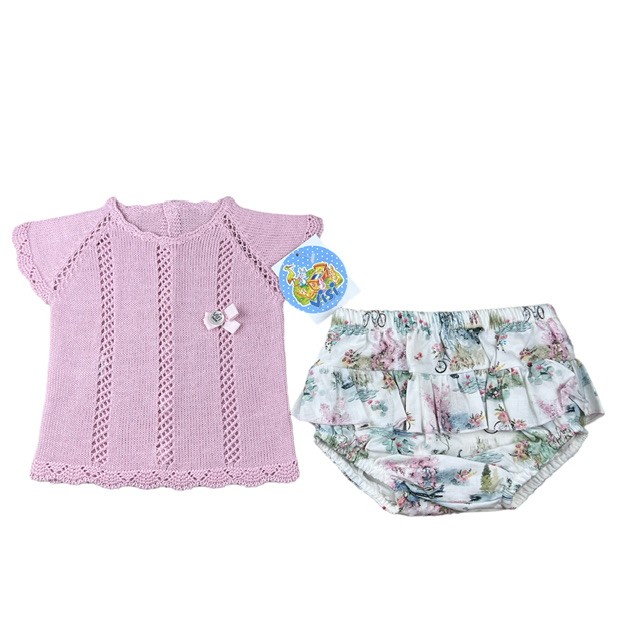 Camiseta de hilo perlé 100% algodón en color rosa maquillaje con detalle columnas caladas. Apertura en la parte trasera con botones.